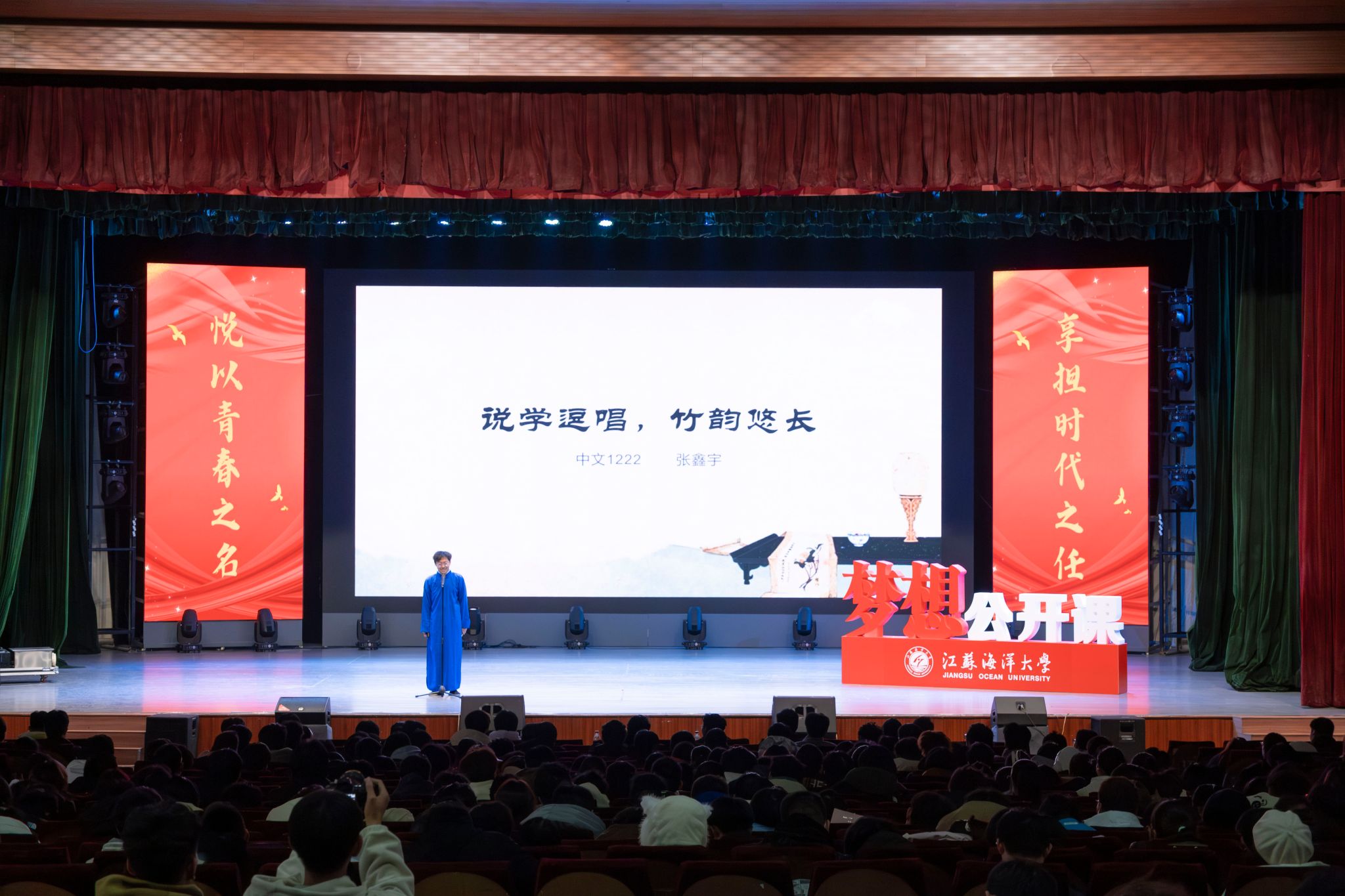 来自土木与港海工程学院的张袁歆以《忠诚履职显担当,拼搏奉献镌初心》为主题向在场同学们分享了自己在担任学生干部这条路上的点滴付出与收获。来自外国语学院的丛显懿以《以吾少年意气,与祖国万里恒昌》为主题,讲述自己以实际行动践行社会主义核心价值观和“强国有我”誓言的故事。在一张张志愿服务照片中,来自文法学院的邓小雨同学声情并茂地分享了自己的志愿服务故事。当节奏紧密的快板声响起,来自文法学院的张鑫宇同学带来了他的故事《说学逗唱,竹韵悠长》,惟妙惟肖的讲述让现场观众都深深感受到了中华优秀传统文化的独特魅力。