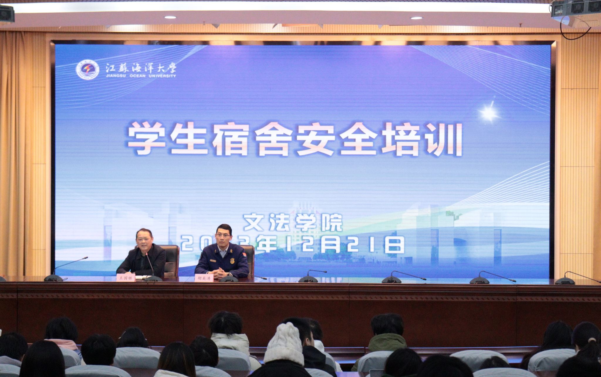 为提高学生消防安全意识,防范宿舍安全风险,12月21日下午5时,文法学院在苍梧校区会议中心黄海厅开展学生宿舍消防安全专题报告会。报告会由文法学院党委副书记王国银主持,连云港市海州区消防救援大队一级指挥员、宣传培训中心主任胡英涛主讲,学院全体研究生、本科生寝室长参与。