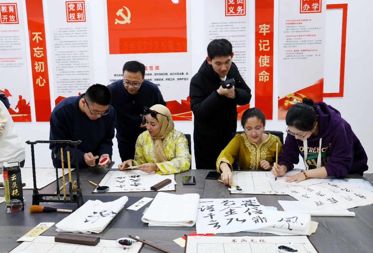马卡洛夫海洋工程学院直属党支部书法爱好者教留学生用毛笔书写自己的国家名字、诚信隽语、廉洁警句