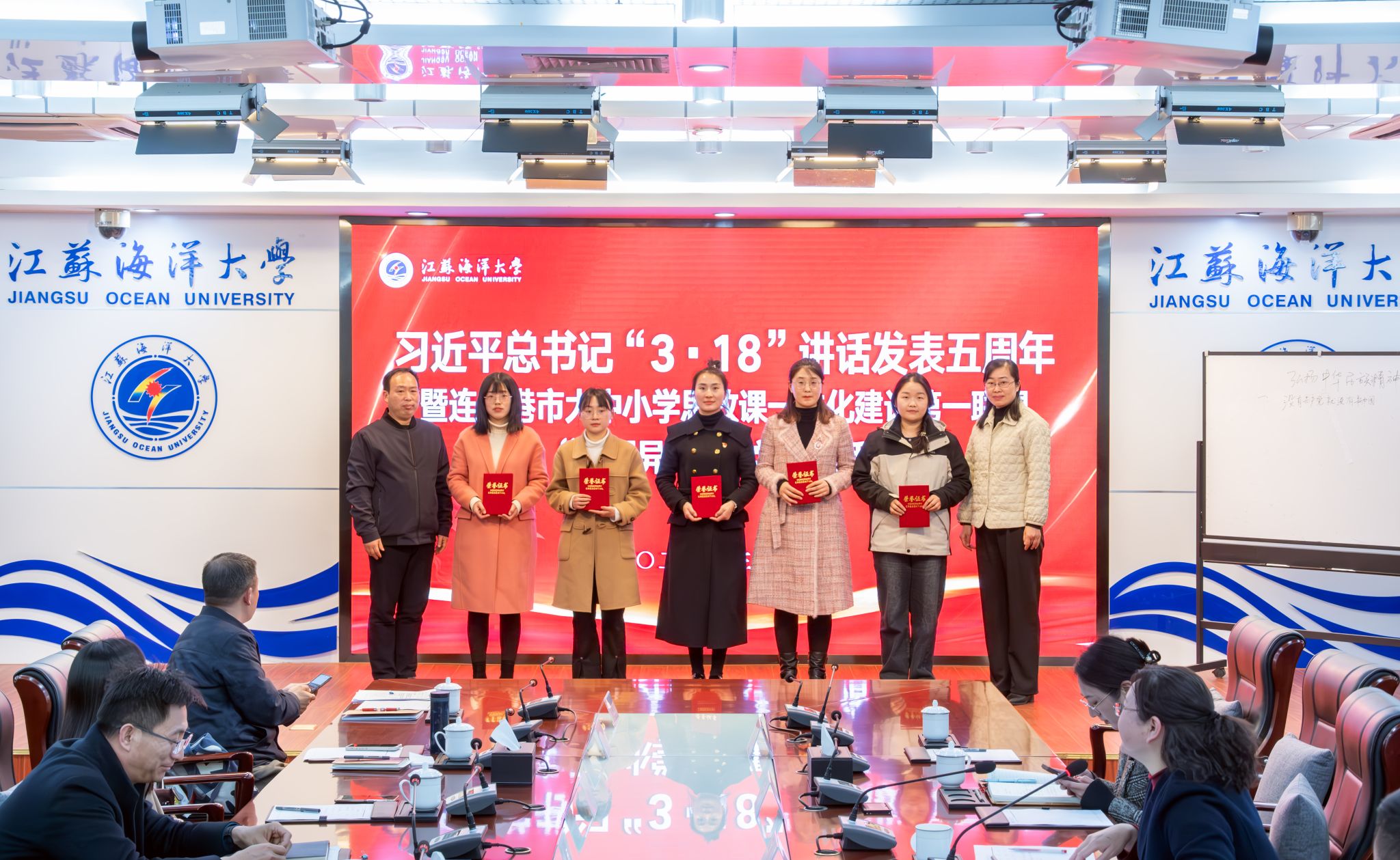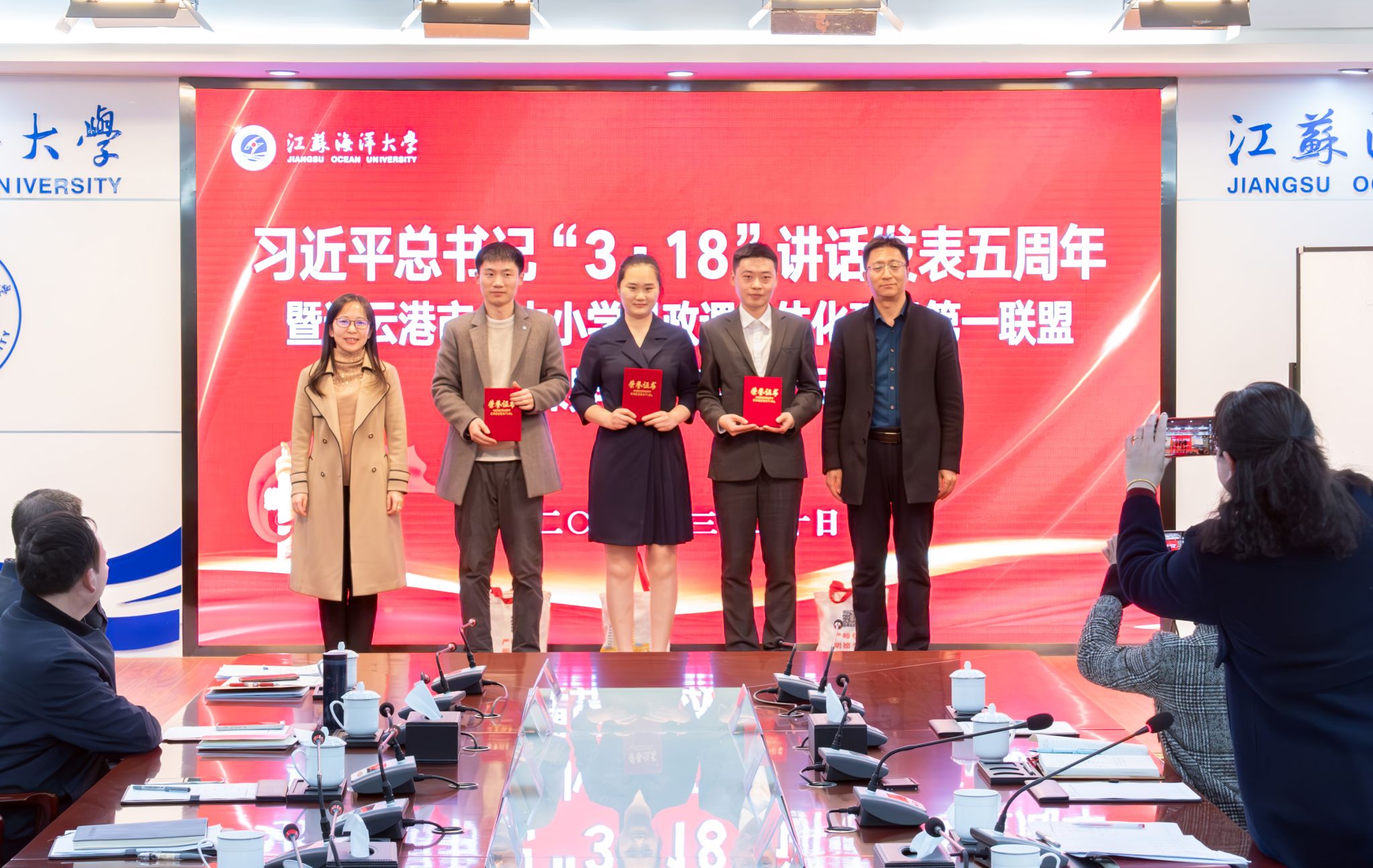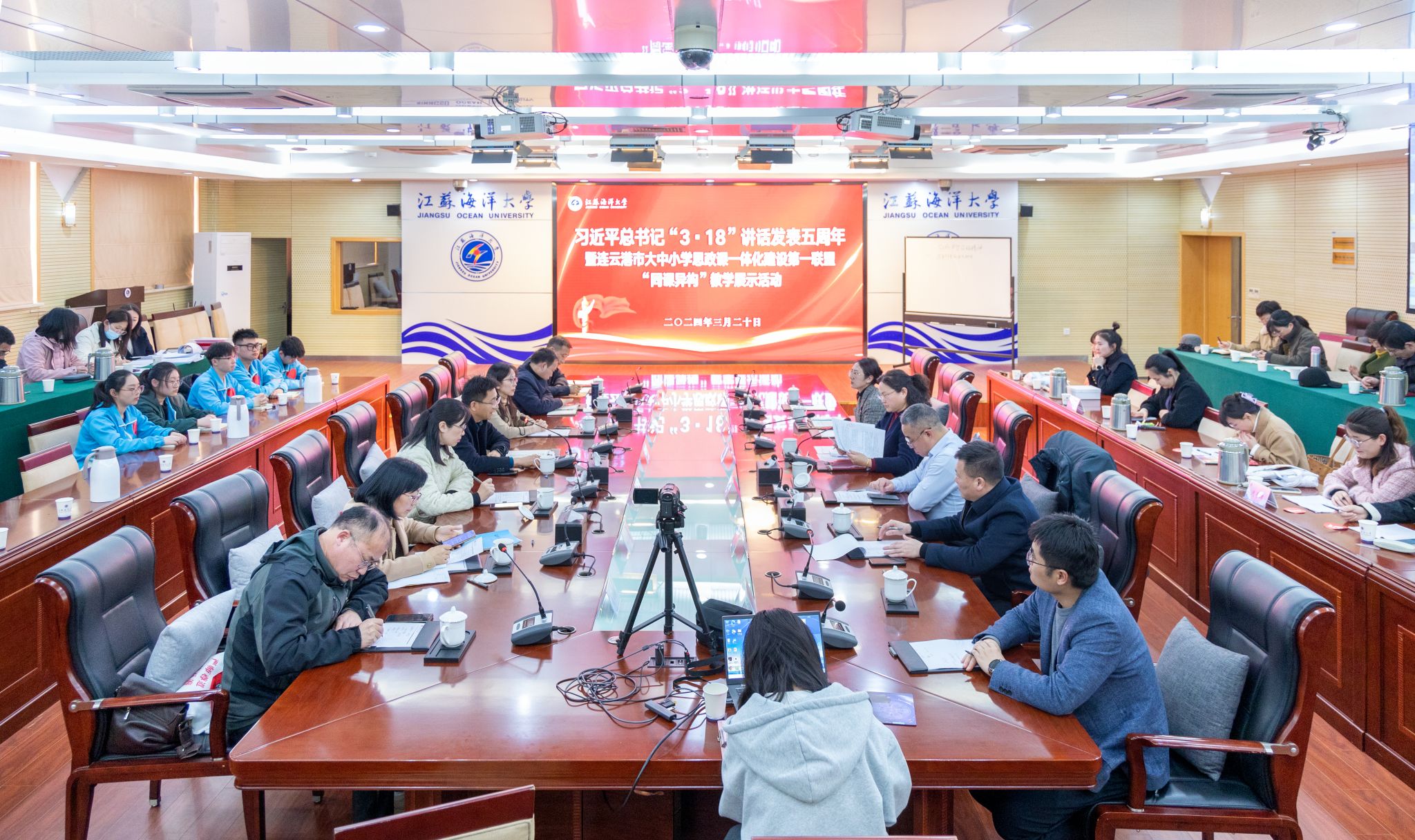 为贯彻习近平总书记“3·18”重要讲话精神,全面落实立德树人根本任务,深化大中小学思政课一体化建设,3月20日下午,连云港市大中小学思政课一体化建设第一教育联盟“同课异构”教学展示活动在我校会议中心东海厅举行。市委教育工委副书记、连云港市大中小学思政课一体化建设指导委员会副主任委员林田海,校党委常委、副校长、连云港市大中小学思政课一体化建设指导委员会副主任委员金芙蓉,市委宣传部宣传处处长、连云港市大中小学思政课一体化指导委员会专家指导组组长马漫利,校党委常委、宣传部部长王波,连云港市教育科学研究所教授、连云港市大中小学思政课一体化指导委员会专家指导组副组长姚玉琴,江苏省新海高级中学正高级教师、连云港市大中小学思政课一体化指导委员会专家指导组成员武兴华,灌南县实验中学党工办主任戴家桂出席活动并担任评委,马克思主义学院全体思政课教师观摩学习,活动由马克思主义学院院长、连云港市大中小学思政课一体化指导委员会专家指导组组长沈春梅主持。
