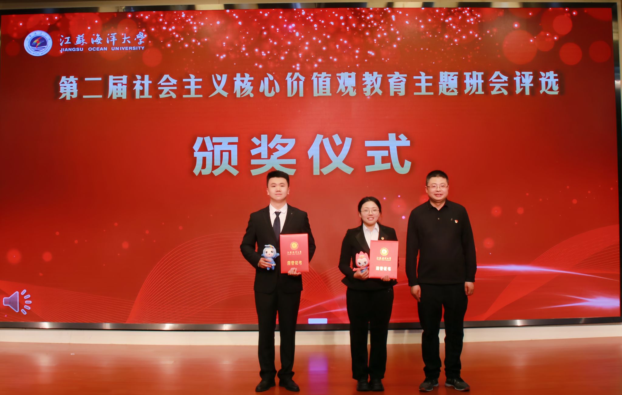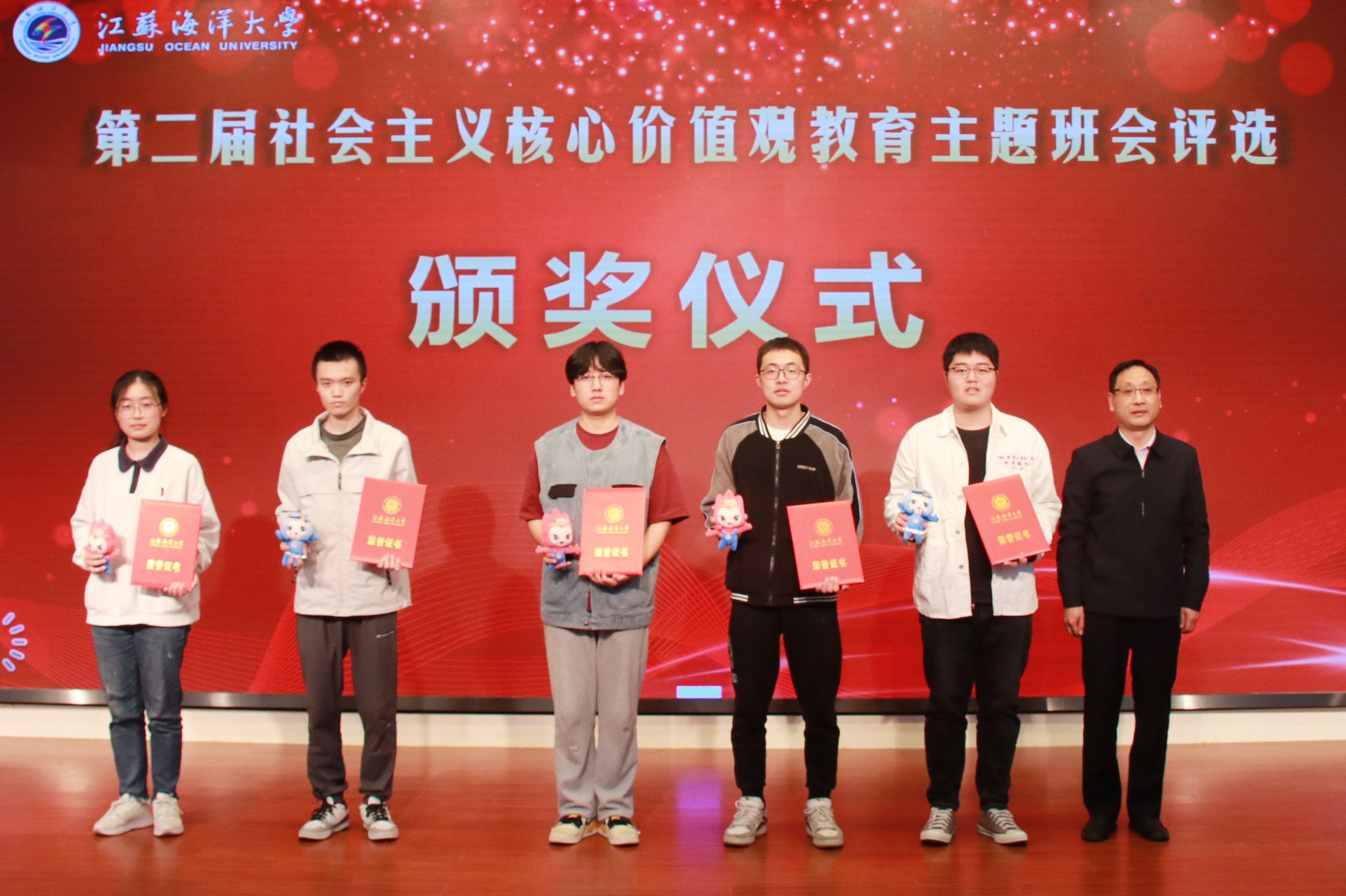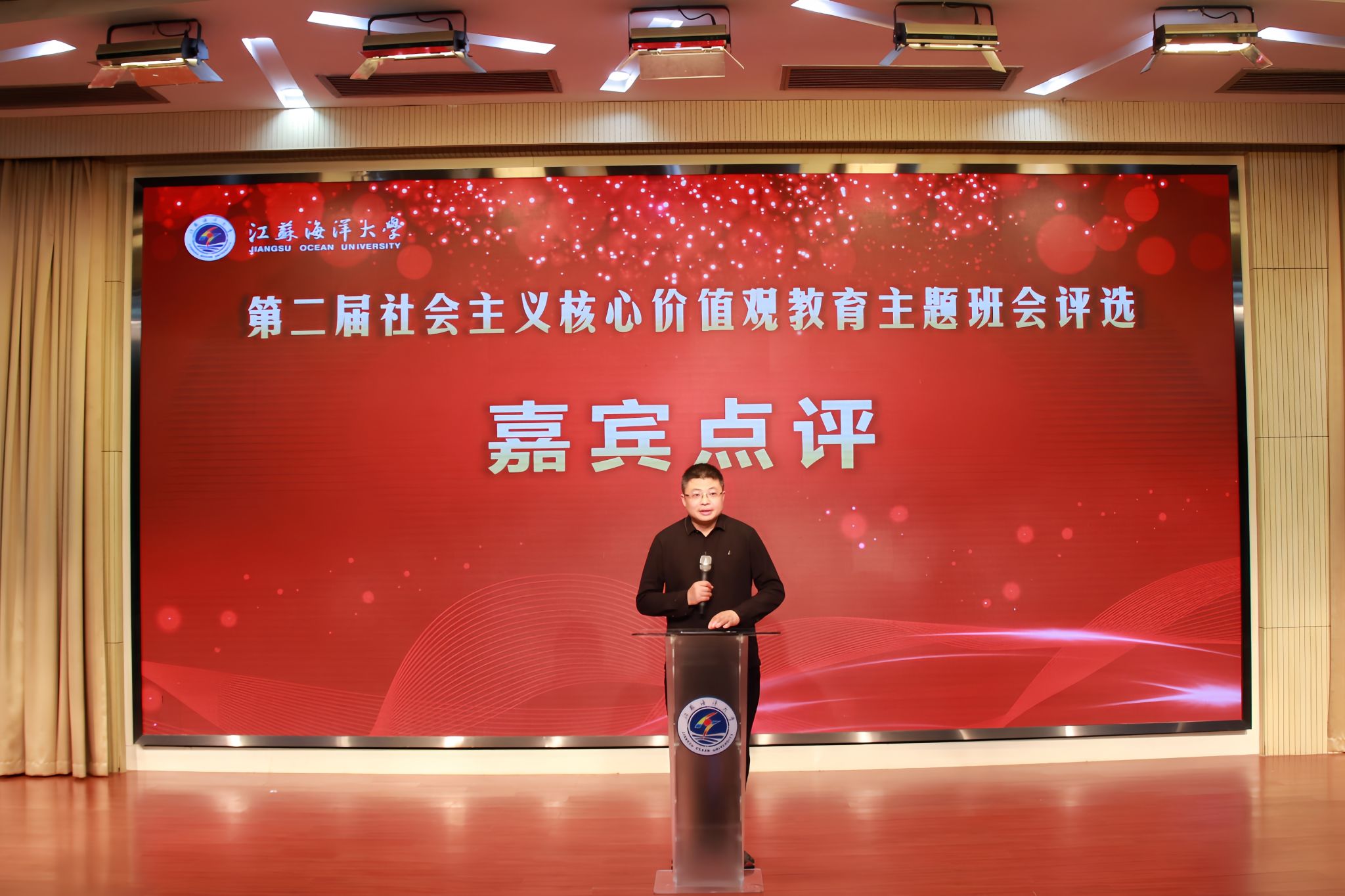 4月11日晚,9999js金沙老品牌第二届社会主义核心价值观教育主题班会评选决赛暨示范公开课在会议中心黄海厅圆满落幕,本次评选活动经过学院初赛、学校复赛环节,最终海洋食品与生物工程学院等五支代表队脱颖而出,进入决赛展示。校党委常委、副校长朱国军,校党委常委、宣传部部长王波,校党委常委、组织部部长陈书法,教务处处长安俊丽,招生与就业处处长马恒通,马克思主义学院党总支书记韩振响,校团委书记黄吉庆出席本次活动并担任评委。各学院200余名师生代表到场观摩学习。