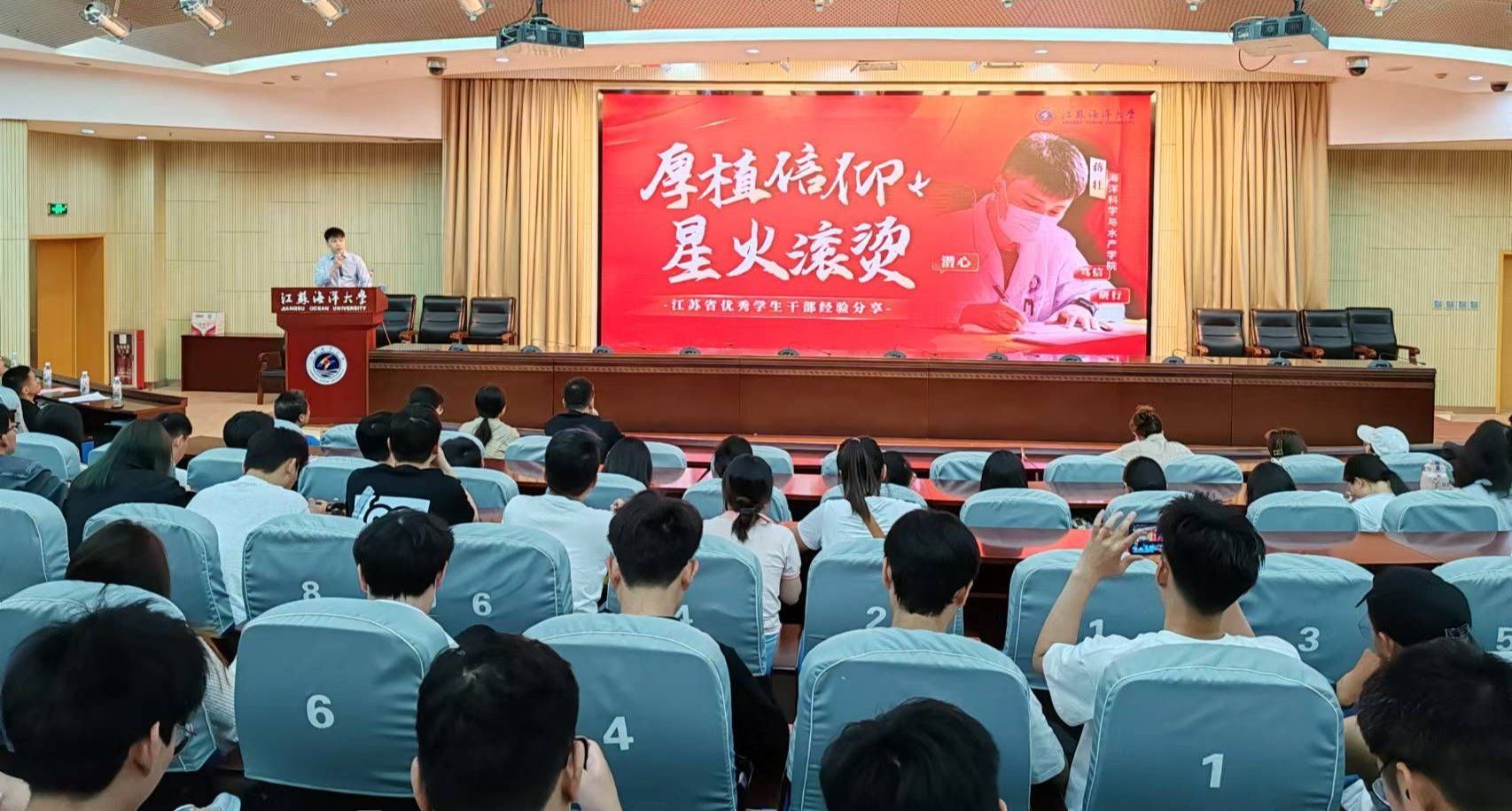 江苏省“优秀学生干部”称号获得者——海洋科学与水产学院2022级研究生蒋壮以《厚植信仰 星火滚烫》为题,从“故事起源——思想篇”“砥砺研思——学习篇”“实干笃行——实践篇”三个方面分享自己入伍、学习科研、社会实践和志愿服务的经历和心得,重点讲述了自己担任学生干部的经历和体会,强调了团队合作、责任担当的重要性,作为学生干部,要时刻关注同学们的需求,积极为大家服务,同时也要摆正位置,不断提升自己的组织协调能力和沟通能力,做到事事有回应,成为有担当有作为的学生干部。该生目前担任校研究生会主席团成员、海洋科学与水产学院研究生会主席团成员和研究生第二党支部宣传委员,荣获发明专利实审4项、二等学业奖学金1次、三等学业奖学金1次,以及2023年江苏省第二届社会实践与志愿服务十佳研究生提名奖、2024年校“优秀研究生干部”、2022年徐州市丰县疫情防控优秀志愿者等殊荣8项,第三届全国大学生数据分析科普竞赛一等奖等学科竞赛4项以及志愿服务证书多项。