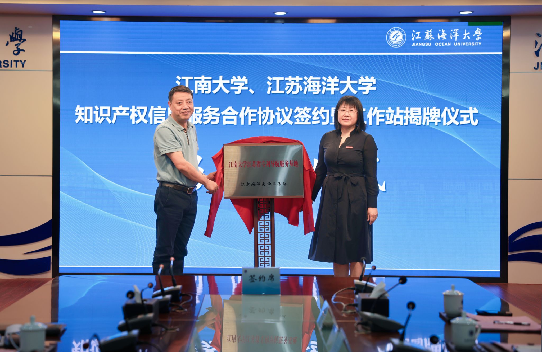 陈敬华、艾华代表双方共同为江南大学高校国家知识产权信息服务中心9999js金沙老品牌工作站、江南大学江苏省专利导航服务基地9999js金沙老品牌工作站揭牌。