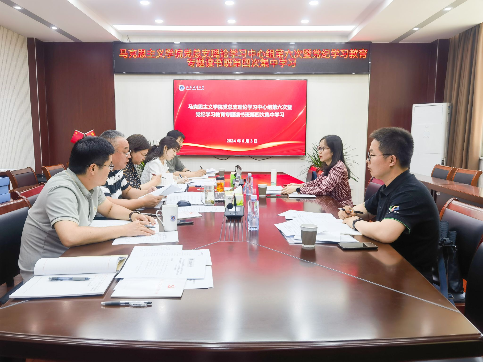 6月3日,马克思主义学院党总支开展理论学习中心组第六次暨党纪学习教育专题读书班第四次集中学习,进行“《中国共产党纪律处分条例》第八章”专题学习。学院党总支书记韩振响领学了《习近平总书记关于廉洁奉公树立新风的重要论述》、《中国共产党纪律处分条例》第八章对违反廉洁纪律行为的处分内容,院长沈春梅领学了《党史上的廉洁纪律建设》、《以纪律自觉增强抵腐定力》,副院长崔家新领学了《求是》杂志文章《廉洁奉公树立新风》。与会人员一起观看了《贪欲之害吴野松违纪违法案例警示录》。韩振响、沈春梅、崔家新和教工党支部书记刘玉良、倪念念结合自身工作进行了交流发言。