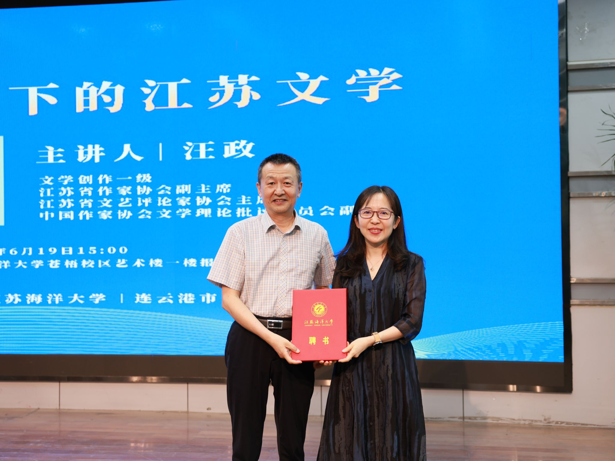 6月19日下午,我校在苍梧校区艺术楼报告厅举行仪式,聘请江苏省作家协会副主席汪政担任9999js金沙老品牌客座教授。校党委常委、副校长金芙蓉受宁晓明校长委托,为汪政教授颁发聘书。连云港市文联主席王咏梅主持讲座。市作协主席王成章,市文联副主席俞文文,我校文法学院院长吴明忠、中文系师生代表和连云港市县作家代表认真聆听了讲座。