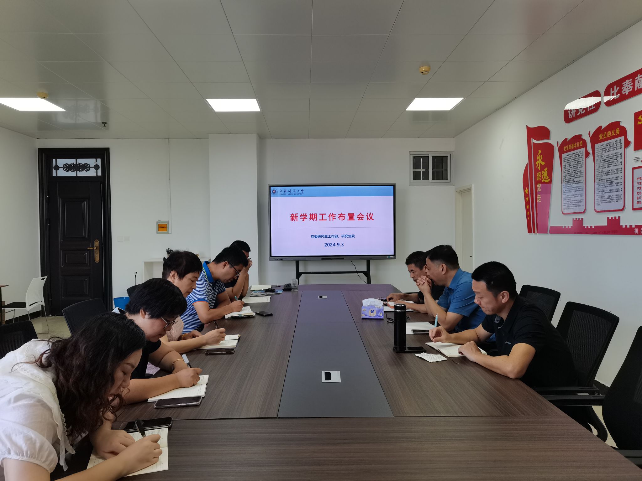 党委研究生工作部副部长、研究院副院长秦海波传达学习了学校迎新协调会的会议精神,并对做好新生报到、住宿、入学体检、资格审查、心理健康普查、入学教育等工作提出要求;同时,对近期开展研究生教育管理、研究生奖学金评选、2025年研究生招生简章和目录编制、促进研究生就业等工作进行布置。