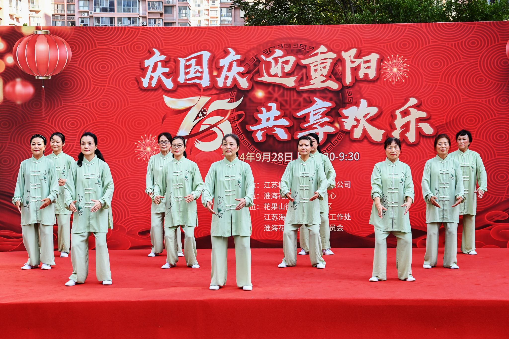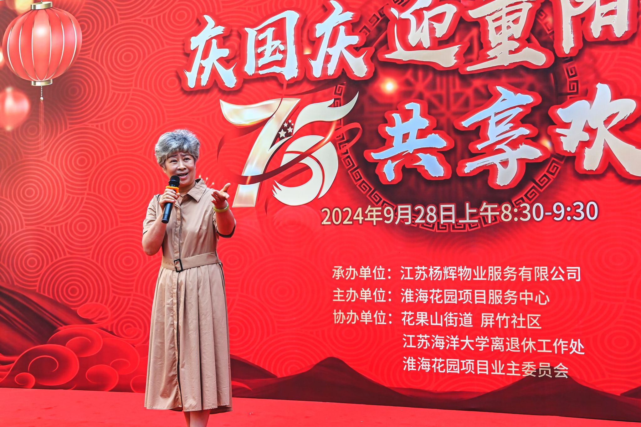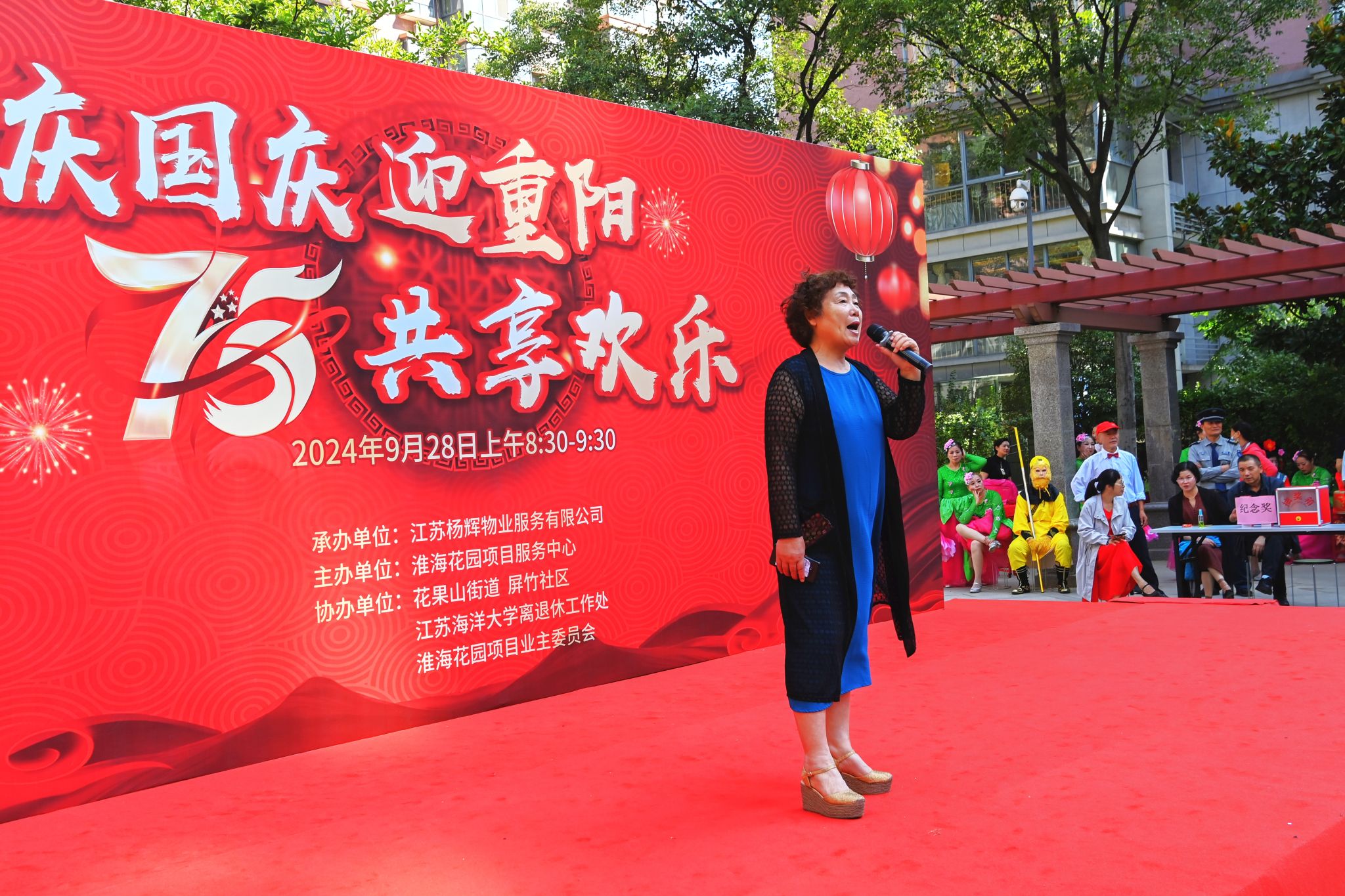 为庆祝中华人民共和国成立75周年,迎接我国第15个“敬老月”,共同欢度国庆和重阳佳节,9月28日上午,我校离退休工作处协同花果山街道屏竹社区、江苏杨辉物业服务有限公司等单位,在淮海花园小区广场举办了“庆国庆 迎重阳”社区文艺演出,我校离退休老同志精心编排了9个节目参演。