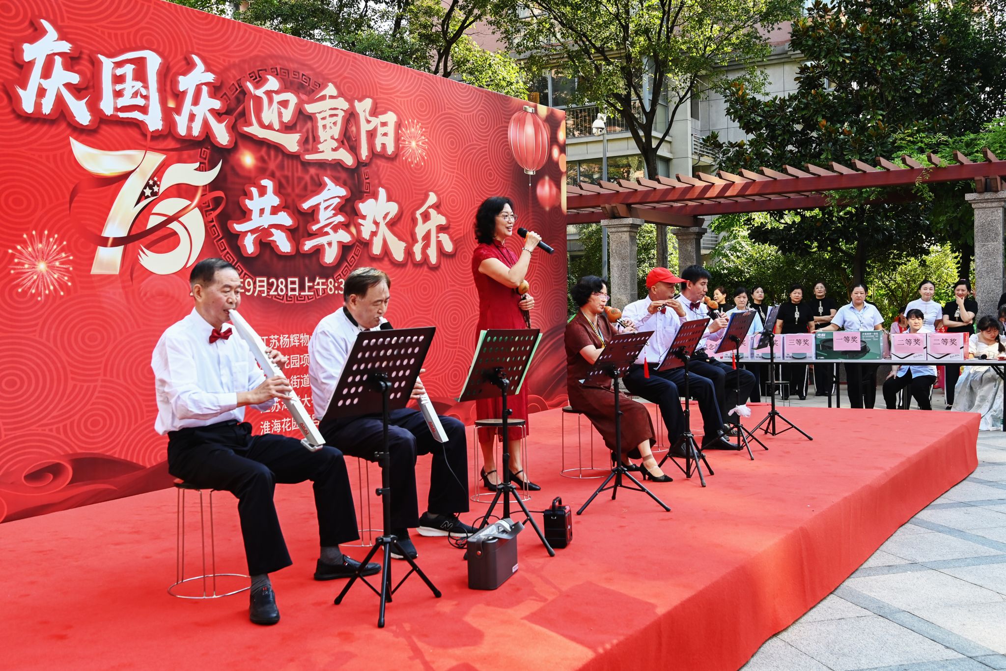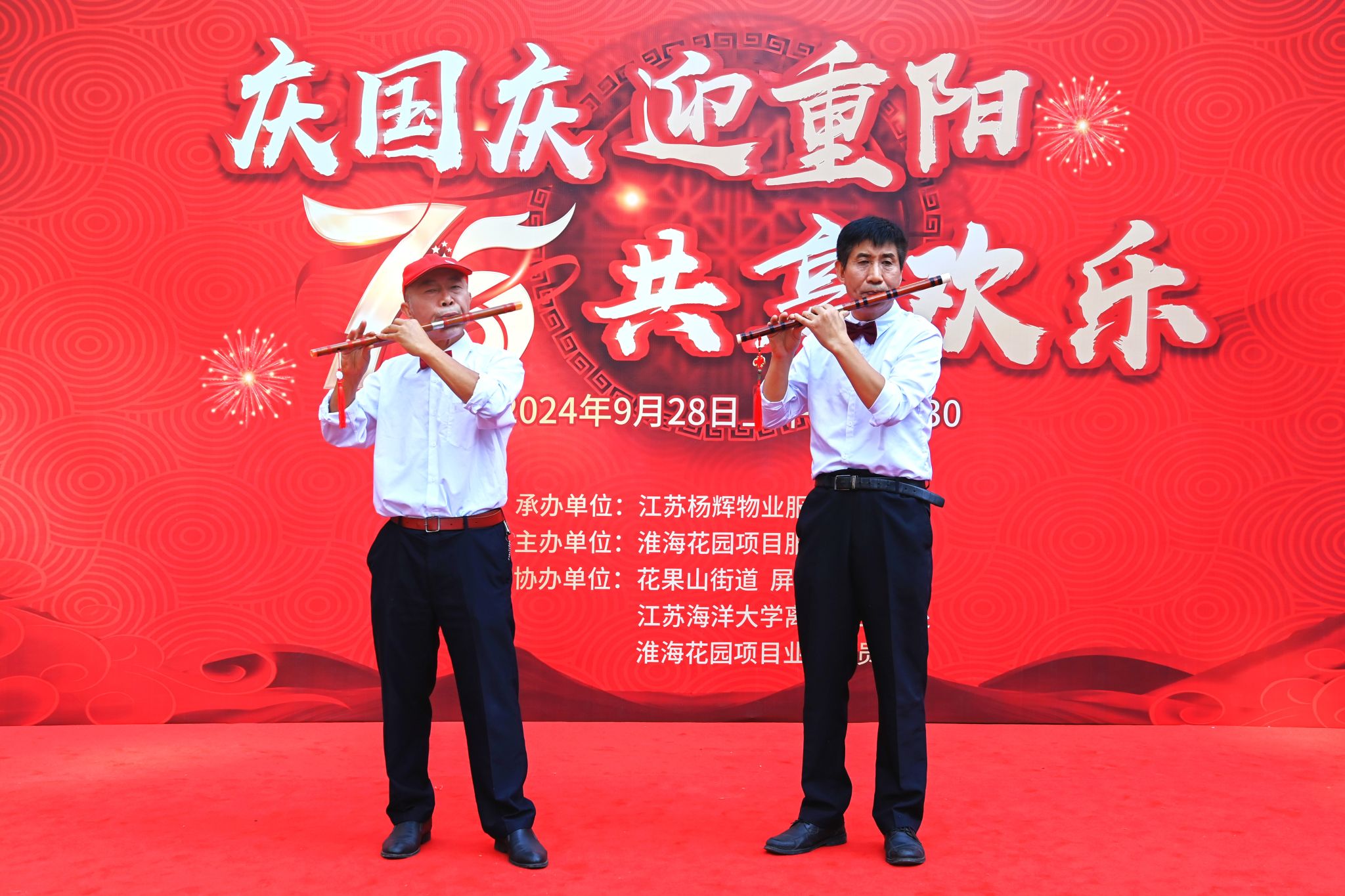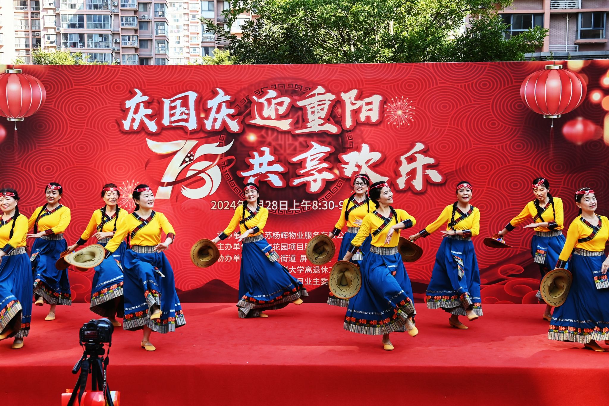 为庆祝中华人民共和国成立75周年,迎接我国第15个“敬老月”,共同欢度国庆和重阳佳节,9月28日上午,我校离退休工作处协同花果山街道屏竹社区、江苏杨辉物业服务有限公司等单位,在淮海花园小区广场举办了“庆国庆 迎重阳”社区文艺演出,我校离退休老同志精心编排了9个节目参演。