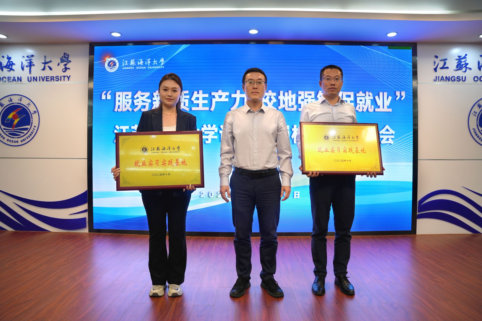 会上招生与就业处副处长骆海宏代表学校与中信证券股份有限公司连云港营业部、江苏康缘药业股份有限公司签订了就业实习实践基地协议,副校长张元良为两家企业颁发了铜牌。