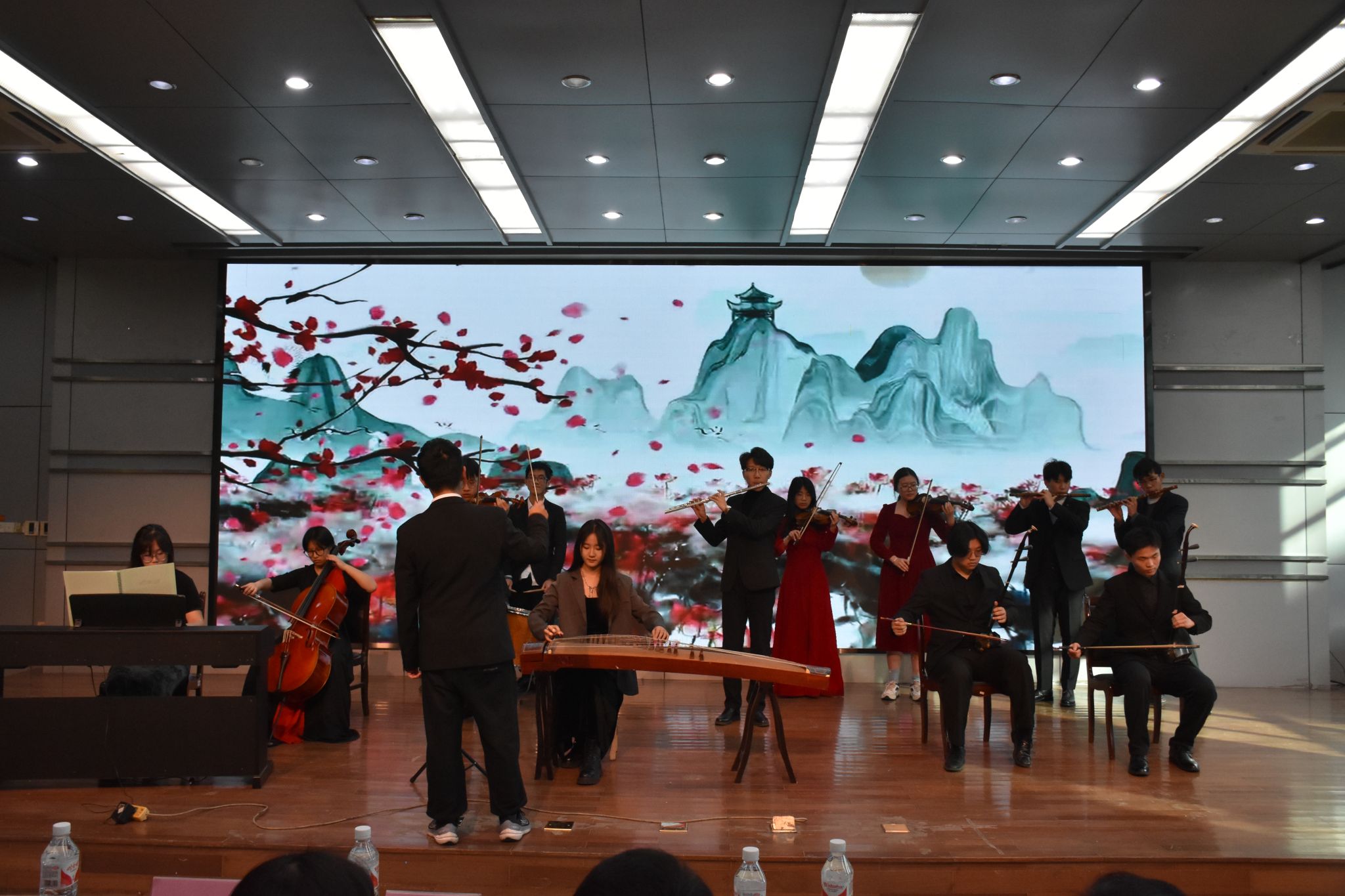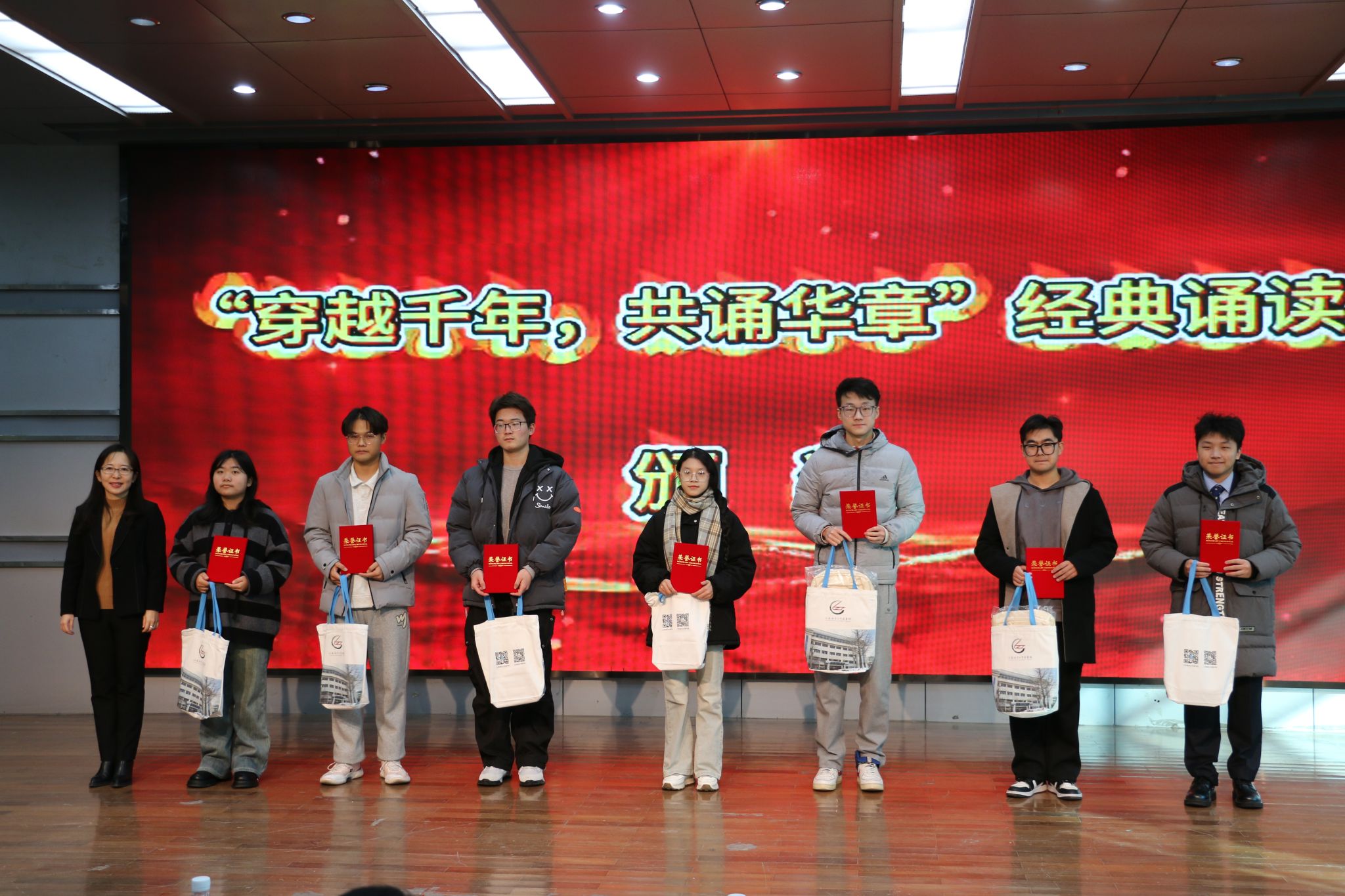 在颁奖典礼上,来自不同学院的获奖学生代表依次上台领取荣誉证书与奖品,并与颁奖嘉宾合影。经典诵读比赛获奖者代表进行现场展示,诵读作品《梦游天姥吟留别》和《雨巷》,“读者之星”获奖者代表分享阅读心得与收获,大学生艺术团的同学表演器乐演奏“梁祝”和歌曲“水韵江苏”。