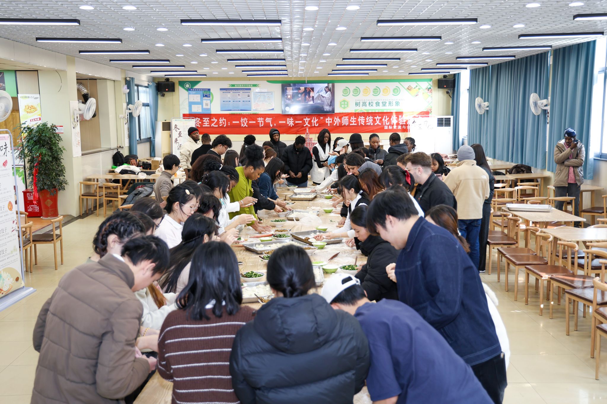 12月21日下午,国际交流与合作处举办“冬至之约:一饺一节气,一味一文化”中外师生传统文化体验活动,来自20个国家70余名中外师生参加活动,体验传统文化,共迎冬至到来。中外师生学习交流了冬至的起源意义与传统习俗,并在食堂师傅的指导下从擀饺子皮、放馅料、包饺子到煮饺子,全程沉浸式体验了中国传统美食饺子的制作过程中。煮饺子期间,中外师生还开展了歌舞表演,活动现场气氛热烈,其乐融融。本次活动让留学生在寒冷的冬至时节感受学校的关怀和温暖,有利于增进中外师生文化交流,弘扬中华传统文化。