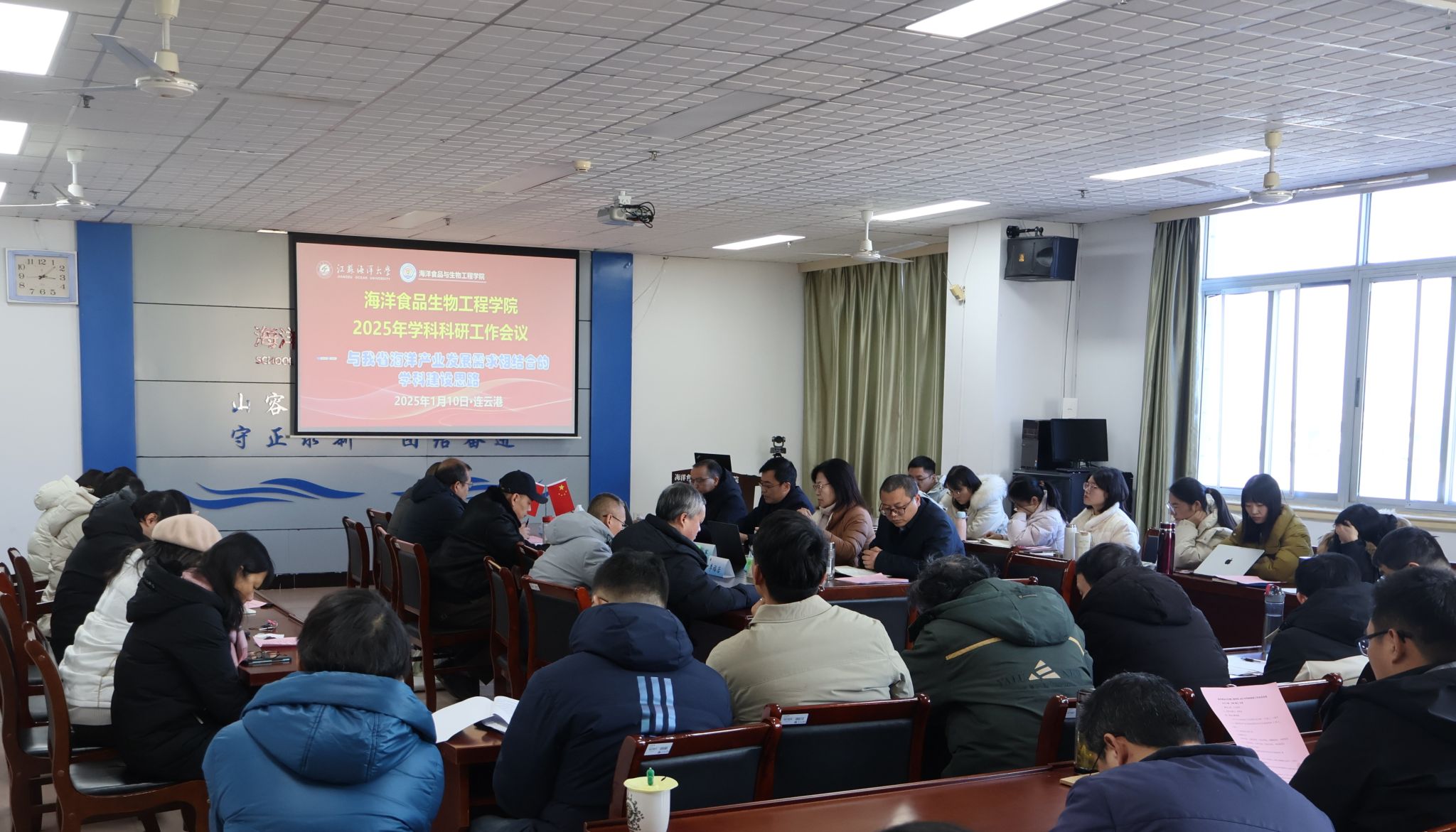 1月10日下午,海洋食品与生物工程学院以“突破 融合 发展”为主题,在文达楼606会议室召开2025年学科科研工作会议,专题落实《江苏省海洋产业发展行动方案》。院长王淑军主持会议。全体教职工参加会议。