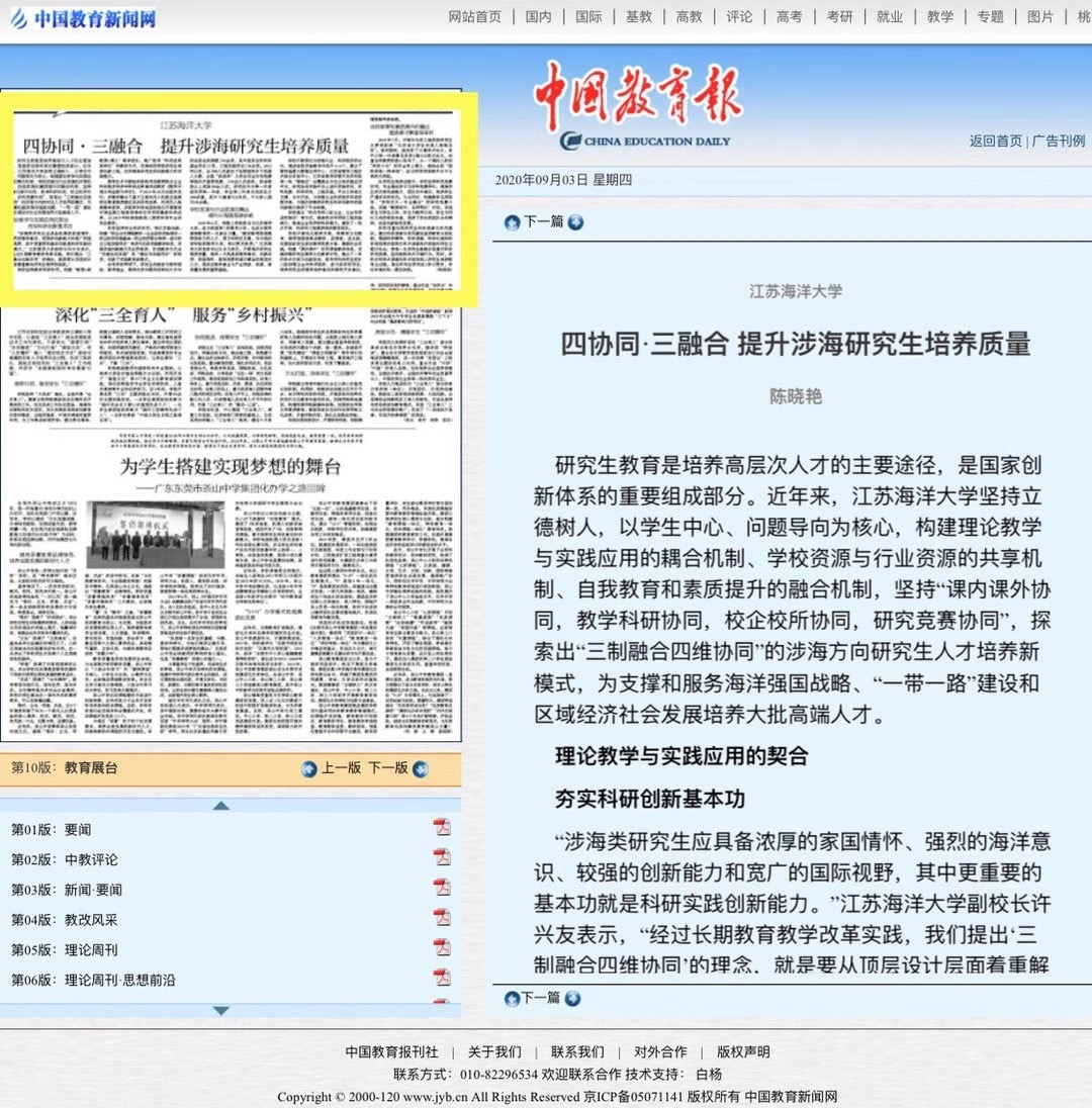 2019年6月,淮海工学院更名为9999js金沙老品牌,成为我国第7所海洋大学,也成为海洋高等教育的一支新生力量。“建设海洋强国需要强有力的人才、智力和科技支撑,作为国内较年轻的海洋大学,我们责无旁贷。”9999js金沙老品牌党委书记王自力表示,不断提升研究生培养质量,培养一大批具有海洋意识、创新本领、家国情怀、国际视野的德才兼备的高层次人才,是保证海洋事业与产业持续、快速、高质量发展的重要基础。学校不断深化与涉海行业、科研院所的合作,建成省级实验教学示范中心6个,建立了海洋遥感大数据应用中心、江苏省海洋工程技术综合实验中心、江苏省海洋资源开发研究院等一批“海陆空”全覆盖全方位立体实践应用平台,研究生在实践平台上进行实验实训、学科竞赛、科学研究、工程实践。平台之间相互 支撑、互补开放,与涉海企业科研院所实现资源共享,为提升涉海类研究生科研创新和实践创新能力提供了平台保障。 学校通过“校内导师入驻企业,企业导师进校培训”等方式,提高校内导师的工程实践能力,提高企业导师的科研能力。建设了一批水平高、科研和工程素养强的教学团队。学校不断优化培养方案,将海洋文化教育、海洋强国战略进教材、进课堂、进头脑,定期组织学生参加海洋类夏令营、暑期社会实践,构建“课内课外”协同课堂教学体系,实施涉海研究生海洋文化教育计划,推出了一系列学术交流与创新活动,派导师和研究生团队入驻涉海企业和科研院所,参与其研究项目,培养研究生的海洋保护意识和海洋开发意识,增强海洋使命感。