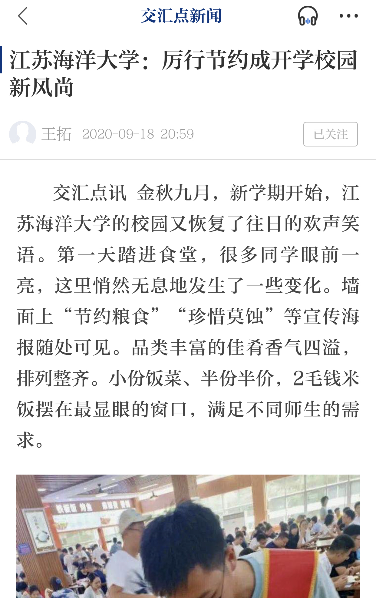 应用技术学院有在食堂门口开展“厉行节约、反对浪费”的师生签名活动,组建了文明就餐劝导员队伍,督导同学们拒绝舌尖上的浪费。有的同学自愿担当“光盘行动”监督员,文明用餐杜绝浪费成了开学校园新风尚,同学们的光盘率越来越高。