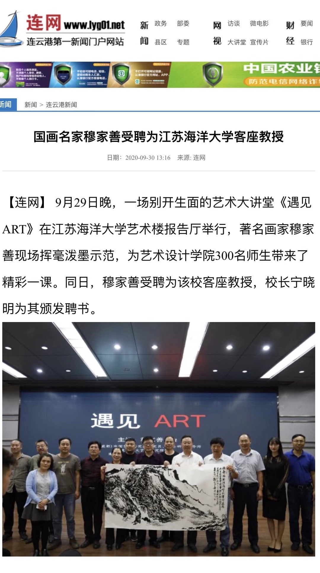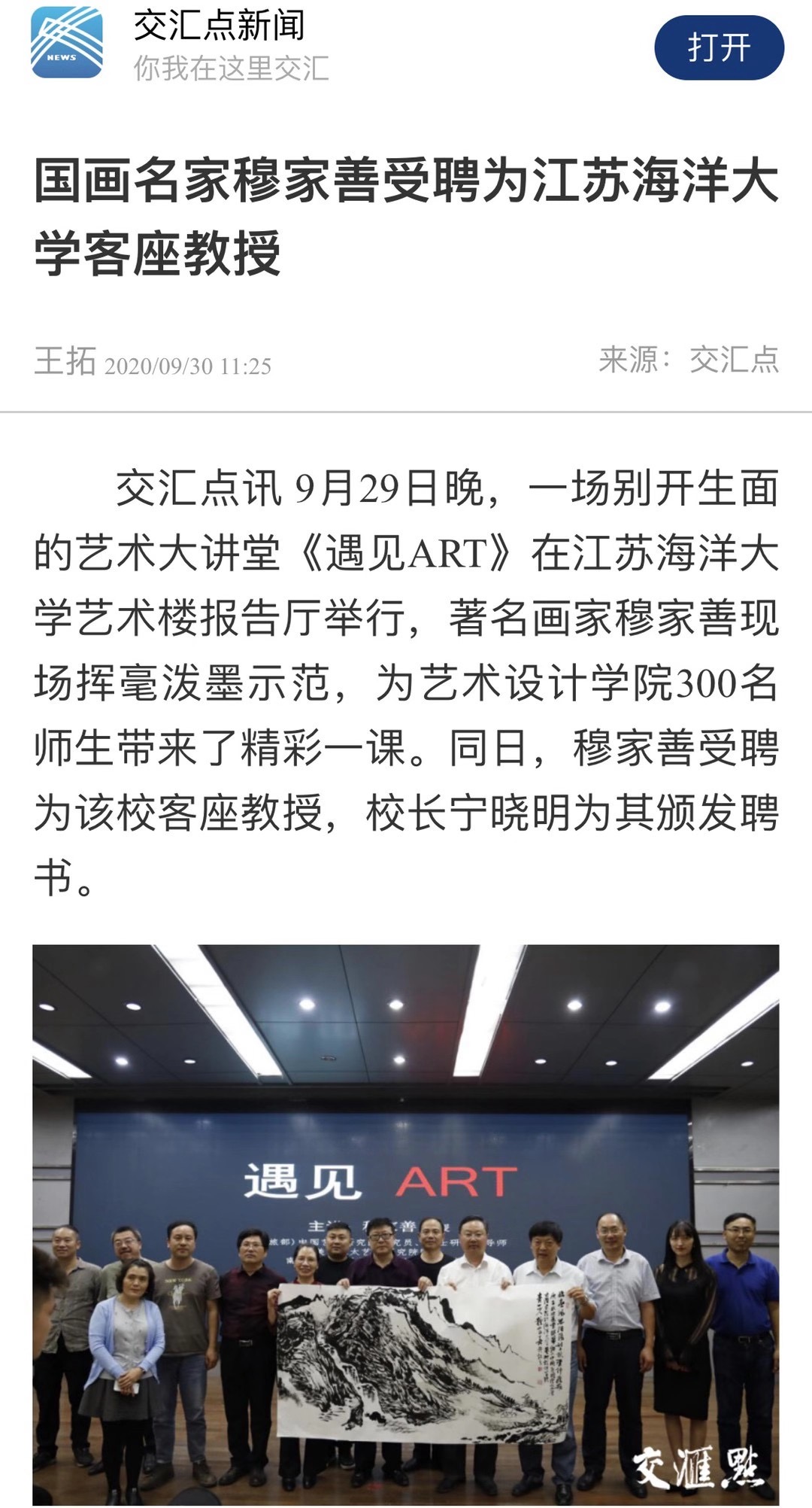 9月29日晚,一场别开生面的艺术大讲堂《遇见ART》在9999js金沙老品牌艺术楼报告厅举行,著名画家穆家善现场挥毫泼墨示范,为艺术设计学院300名师生带来了精彩一课。同日,穆家善受聘为该校客座教授,校长宁晓明为其颁发聘书。