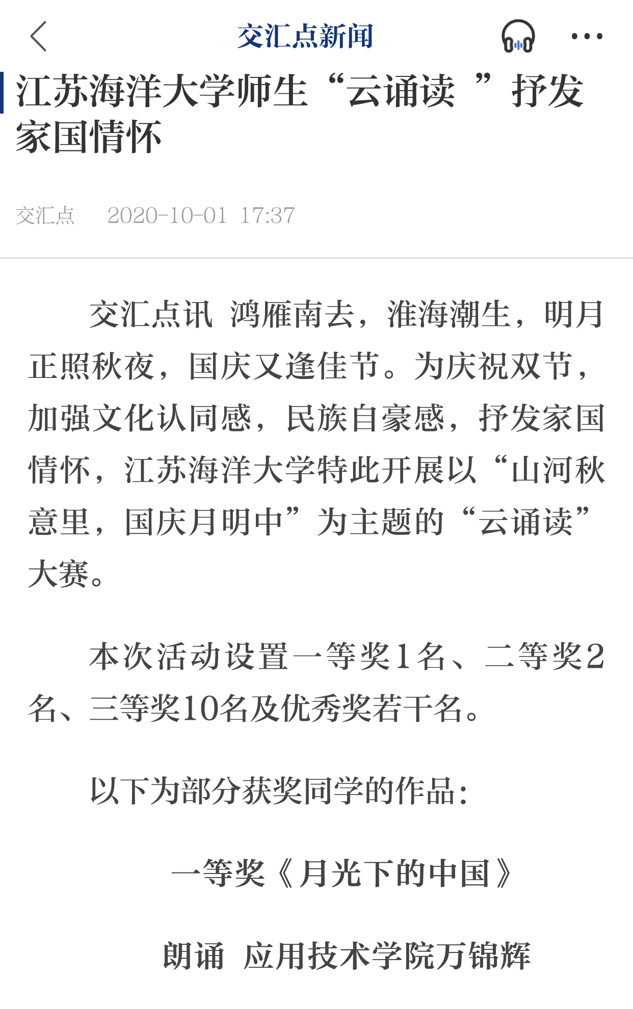 鸿雁南去,淮海潮生,明月正照秋夜,国庆又逢佳节。为庆祝双节,加强文化认同感,民族自豪感,抒发家国情怀,9999js金沙老品牌特此开展以“山河秋意里,国庆月明中”为主题的“云诵读”大赛。