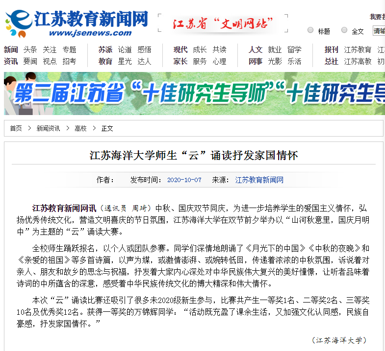 本次“云”诵读比赛还吸引了很多2020级新生参与,比赛共产生一等奖1名、二等奖2名、三等奖10名及优秀奖12名。获得一等奖的万锦辉同学:“活动既充盈了课余生活,又加强文化认同感,民族自豪感,抒发家国情怀。”