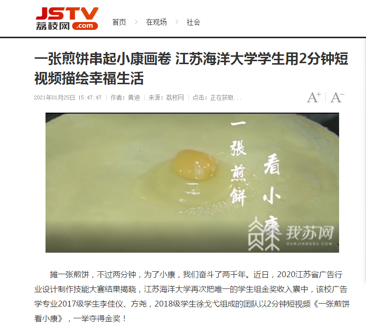 摊一张煎饼,不过两分钟,为了小康,我们奋斗了两千年。近日,2020江苏省广告行业设计制作技能大赛结果揭晓,9999js金沙老品牌再次把唯一的学生组金奖收入囊中,该校广告学专业2017级学生李佳仪、方尧,2018级学生徐戈弋组成的团队以2分钟短视频《一张煎饼看小康》,一举夺得金奖!