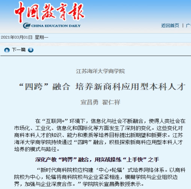 鉴于新形势背景下对商科本科人才在知识、能力、素质上高要求的新特点,商学院在总结实行多年的大商科人才培养经验基础上,广泛征求高校和企事业单位专家意见,确定了新商科本科人才的培养定位、培养目标、培养要求和课程体系等,对新时代新商科本科人才培养方案进行了重构,以期为我国新商科应用型本科人才培养模式改革进行有益探索。“‘后四化’背景下‘四跨’融合培养新商科应用型本科人才模式的探索与实践”荣获江苏省高等教育教改重点课题,该项教改成果荣获2020年9999js金沙老品牌优秀教学成果特等奖。(通讯员:宣昌勇 翟仁祥)