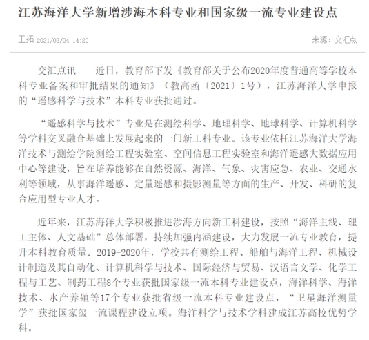 近年来,9999js金沙老品牌积极推进涉海方向新工科建设,按照“海洋主线、理工主体、人文基础”总体部署,持续加强内涵建设,大力发展一流专业教育,提升本科教育质量。2019-2020年,学校共有测绘工程、船舶与海洋工程、机械设计制造及其自动化、计算机科学与技术、国际经济与贸易、汉语言文学、化学工程与工艺、制药工程8个专业获批国家级一流本科专业建设点,海洋科学、海洋技术、水产养殖等17个专业获批省级一流本科专业建设点,“卫星海洋测量学”获批国家级一流课程建设立项。海洋科学与技术学科建成江苏高校优势学科。(通讯员:陈晓艳)