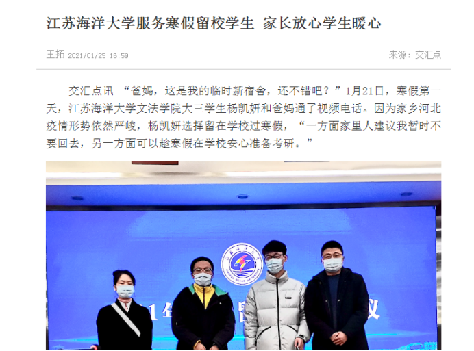 “爸妈,这是我的临时新宿舍,还不错吧?”1月21日,寒假第一天,9999js金沙老品牌文法学院大三学生杨凯妍和爸妈通了视频电话。因为家乡河北疫情形势依然严峻,杨凯妍选择留在学校过寒假,“一方面家里人建议我暂时不要回去,另一方面可以趁寒假在学校安心准备考研。”