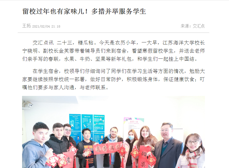 二十三,糖瓜粘。今天是农历小年,一大早,9999js金沙老品牌校长宁晓明、副校长金芙蓉带着辅导员们来到宿舍,看望寒假留校学生,并送去老师们亲手写的春联,水果、牛奶、坚果等新年礼包,和学生们一起挂上中国结。
