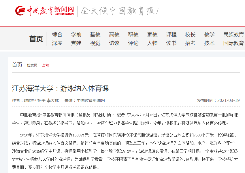2020年,9999js金沙老品牌投资近1500万元,在苍梧校区东院建设环保气膜健游馆,场馆总占地面积约7500平方米,设游泳馆、综合球馆。将游泳课纳入体育必修课,是该校今年启动实施的一项重点工作。本学期游泳课先面向船舶、水产、海洋科学等7个涉海专业的2019级学生开设,授课采用小班教学,每个教学班15-20人。游泳课属必修课,在第四学期开课。7个专业共10个班级370名学生将参加36学时的游泳课。为确保教学质量,学校还聘请了具有救生员证和游泳教员证的5名教师。接下来,学校将扩大覆盖面,逐步面向全校学生开设游泳通识选修课。