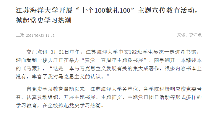 各学院纷纷利用微信公众号,结合专业特色,面向学生群体推送转载“党史上的今天”“党史百年天天读”等党史学习资料。商学院推出“百篇诵读演绎百年党史”电台,百名学生接力诵读党史,用声音倾情讲述党的故事,传递党的伟大精神。艺术设计学院官微推出的“美术经典中的党史”专栏,借以艺术作品的形式热情讴歌了党的奋斗历程,用喜闻乐见的方式宣传党史。马克思主义学院和艺术设计学院师生们选取百年党史中的100个重要历史事件,正在积极创作100幅绘画作品,用实际行动向党的百年华诞献礼。