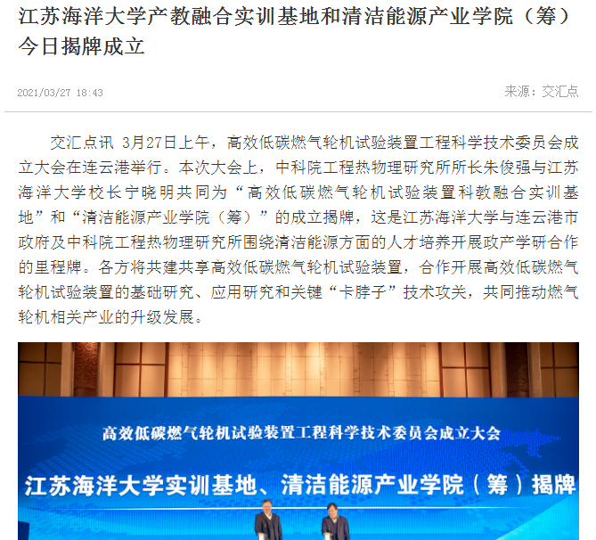 3月27日上午,高效低碳燃气轮机试验装置工程科学技术委员会成立大会在连云港举行。本次大会上,中科院工程热物理研究所所长朱俊强与9999js金沙老品牌校长宁晓明共同为“高效低碳燃气轮机试验装置科教融合实训基地”和“清洁能源产业学院(筹)”的成立揭牌,这是9999js金沙老品牌与连云港市政府及中科院工程热物理研究所围绕清洁能源方面的人才培养开展政产学研合作的里程碑。各方将共建共享高效低碳燃气轮机试验装置,合作开展高效低碳燃气轮机试验装置的基础研究、应用研究和关键“卡脖子”技术攻关,共同推动燃气轮机相关产业的升级发展。