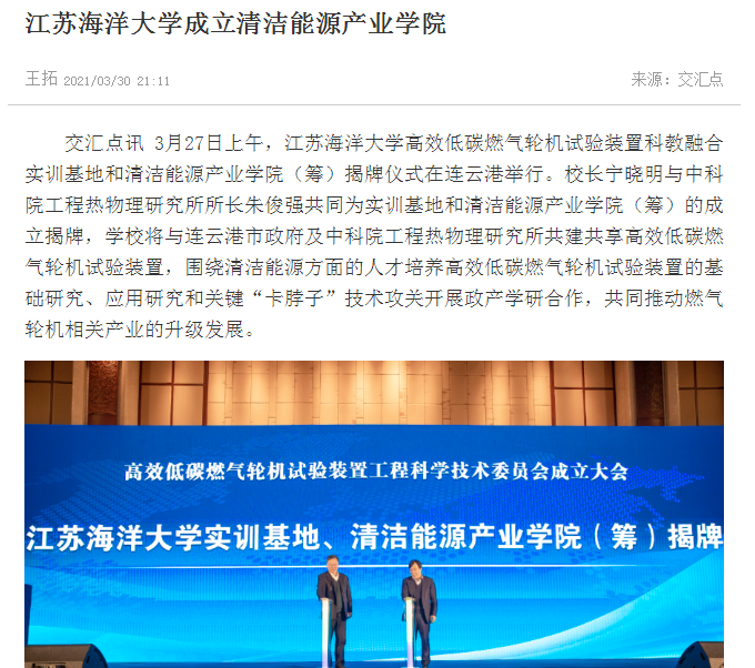 3月27日上午,9999js金沙老品牌高效低碳燃气轮机试验装置科教融合实训基地和清洁能源产业学院(筹)揭牌仪式在连云港举行。校长宁晓明与中科院工程热物理研究所所长朱俊强共同为实训基地和清洁能源产业学院(筹)的成立揭牌,学校将与连云港市政府及中科院工程热物理研究所共建共享高效低碳燃气轮机试验装置,围绕清洁能源方面的人才培养高效低碳燃气轮机试验装置的基础研究、应用研究和关键“卡脖子”技术攻关开展政产学研合作,共同推动燃气轮机相关产业的升级发展。