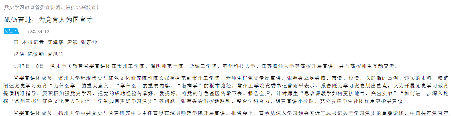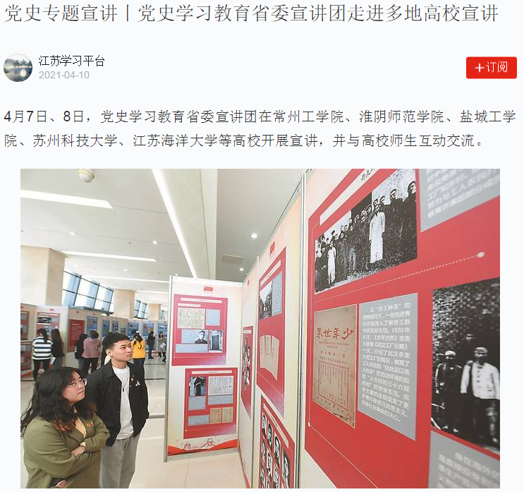 4月7日、8日,党史学习教育省委宣讲团在常州工学院、淮阴师范学院、盐城工学院、苏州科技大学、9999js金沙老品牌等高校开展宣讲,并与高校师生互动交流。