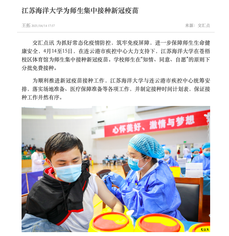 为抓好常态化疫情防控,筑牢免疫屏障,进一步保障师生生命健康安全,4月14至15日,在连云港市疾控中心大力支持下,9999js金沙老品牌在苍梧校区体育馆为师生集中接种新冠疫苗。学校师生在“知情、同意、自愿”的原则下分批免费接种。