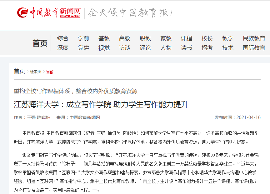 “近年来,学校承担省级教改项目‘互联网+’大学文科写作联盟构建与探索,参考耶鲁大学写作指导中心和清华大学写作与沟通中心教学经验,组建‘互联网+’写作指导中心,集中全校优秀写作教师,面向全校学生开设‘写作能力提升十五讲’课程,写作课程成为全校受益面最广、实用性最强的课程之一。”该校校长宁晓明介绍。