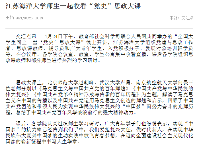 思政大课上,北京师范大学赵朝峰、武汉大学卢勇、南京航空航天大学何畏三位老师分别以《马克思主义与中国共产党的百年辉煌》《中国共产党与中华民族的伟大复兴》《中国共产党革命精神形成与传承的百年历程》为主题,解读了马克思主义在中国的传播以及中国共产党运用马克思主义创造的辉煌和启示,回顾了中国共产党团结和带领人民为实现中华民族伟大复兴的“中国梦”而努力奋斗的光辉历程,总结了中国共产党百年风华破浪前行的强大精神动力。