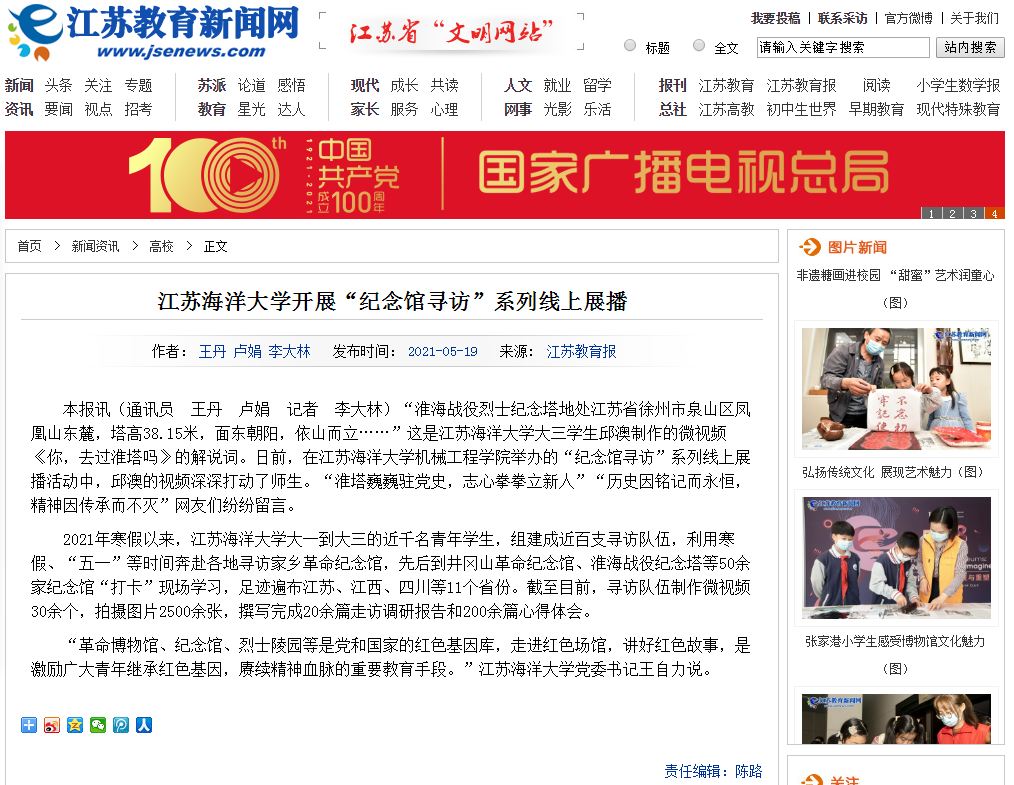 2021年寒假以来,9999js金沙老品牌大一到大三的近千名青年学生,组建成近百支寻访队伍,利用寒假、“五一”等时间奔赴各地寻访家乡革命纪念馆,先后到井冈山革命纪念馆、淮海战役纪念塔等50余家纪念馆“打卡”现场学习,足迹遍布江苏、江西、四川等11个省份。截至目前,寻访队伍制作微视频30余个,拍摄图片2500余张,撰写完成20余篇走访调研报告和200余篇心得体会。