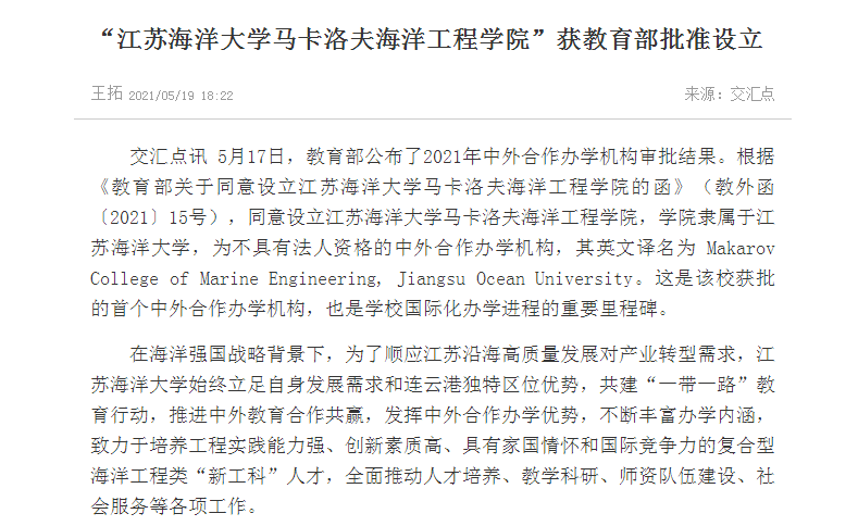 5月17日,教育部公布了2021年中外合作办学机构审批结果。根据《教育部关于同意设立9999js金沙老品牌马卡洛夫海洋工程学院的函》(教外函〔2021〕15号),同意设立9999js金沙老品牌马卡洛夫海洋工程学院,学院隶属于9999js金沙老品牌,为不具有法人资格的中外合作办学机构,其英文译名为 Makarov College of Marine Engineering, Jiangsu Ocean University。这是该校获批的首个中外合作办学机构,也是学校国际化办学进程的重要里程碑。