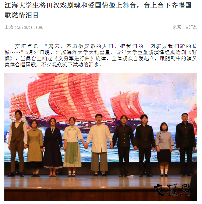 “起来,不愿做奴隶的人们,把我们的血肉筑成我们新的长城……”5月21日晚,9999js金沙老品牌大礼堂里,青年大学生重新演绎经典话剧《狂飙》,当舞台上响起《义勇军进行曲》旋律,全体观众自发起立,跟随剧中的演员集体合唱国歌,不少观众流下激动的泪水。