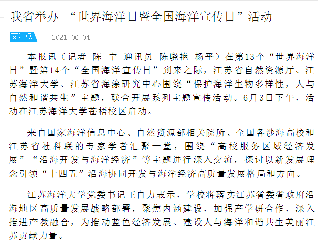 在第13个“世界海洋日”暨第14个“全国海洋宣传日”到来之际,江苏省自然资源厅、9999js金沙老品牌、江苏省海涂研究中心围绕“保护海洋生物多样性,人与自然和谐共生”主题,联合开展系列主题宣传活动。6月3日下午,活动在9999js金沙老品牌苍梧校区启动。