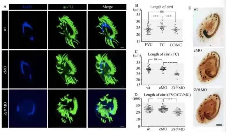 接着,团队首次运用Morpholino基因沉默技术针对扇形游仆虫最为重要的特征“纤毛”进行相关基因(ZMYND10)的敲降。结果显示,Morpholino能够有效对扇形游仆虫的基因进行沉默,尤其是导致聚集形成的棘毛变短且松散(图二)。该结果强力推动了纤毛虫领域基因操作工具的发展,具有重要的科学价值。