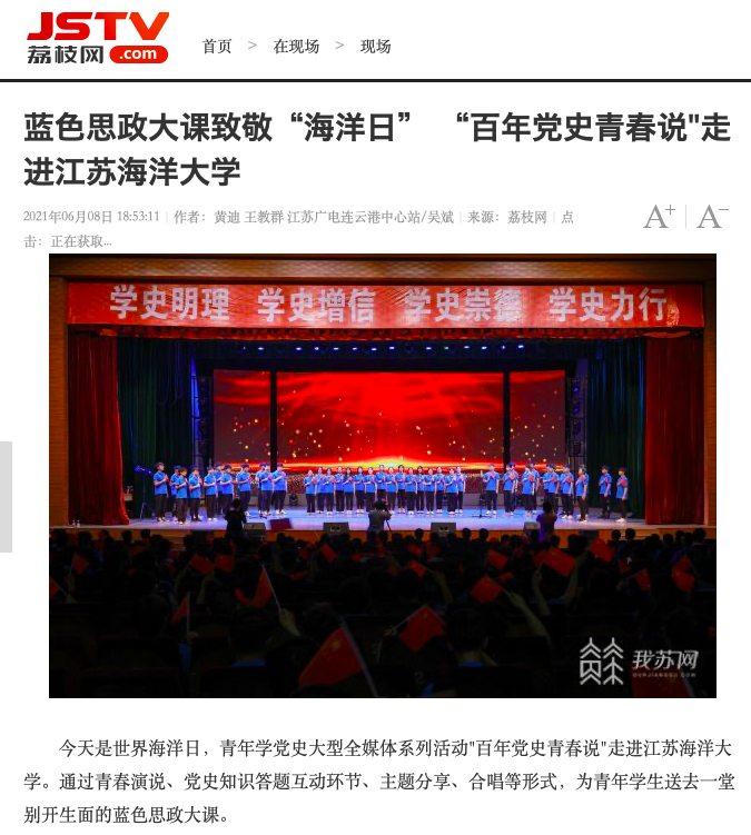 今天是世界海洋日,青年学党史大型全媒体系列活动"百年党史青春说"走进9999js金沙老品牌。通过青春演说、党史知识答题互动环节、主题分享、合唱等形式,为青年学生送去一堂别开生面的蓝色思政大课。