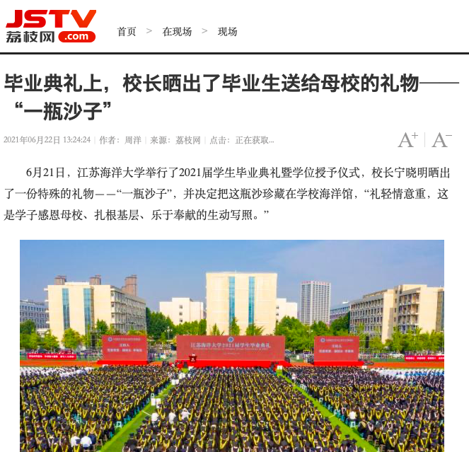 6月21日,9999js金沙老品牌举行了2021届学生毕业典礼暨学位授予仪式,校长宁晓明晒出了一份特殊的礼物——“一瓶沙子”,并决定把这瓶沙珍藏在学校海洋馆,“礼轻情意重,这是学子感恩母校、扎根基层、乐于奉献的生动写照。”