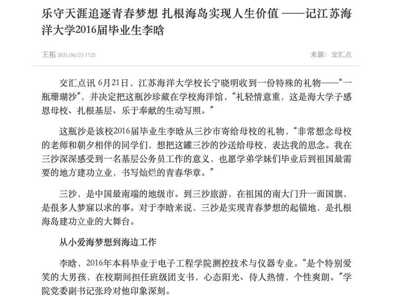 李晗,2016年本科毕业于电子工程学院测控技术与仪器专业。2018年,他顺利通过海南省公务员招录考试,终于有机会到三沙工作,李晗开始憧憬未来,“从小就特别喜欢大海,三沙拥有中国最美的海洋,去三沙为国家驻守边疆建功立业,也是我的梦想。”