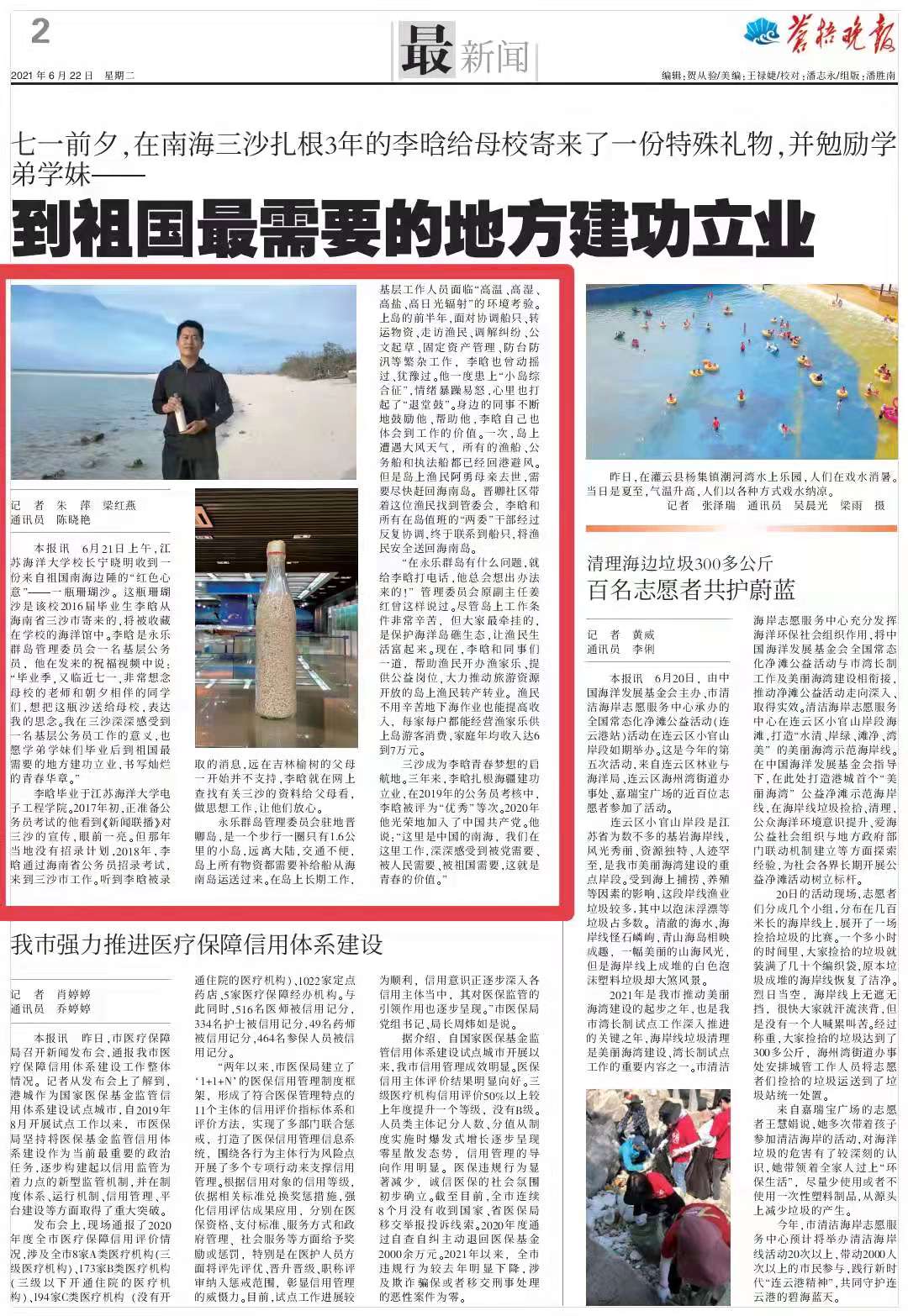 “在永乐群岛有什么问题,就给李晗打电话,他总会想出办法来的!”三沙市永乐群岛管理委员会原副主任姜红曾这样说过。2019年的公务员考核中,李晗被评为“优秀”等次;2020年7月,李晗光荣地加入了中国共产党。