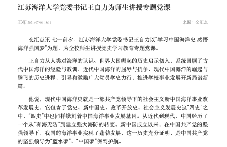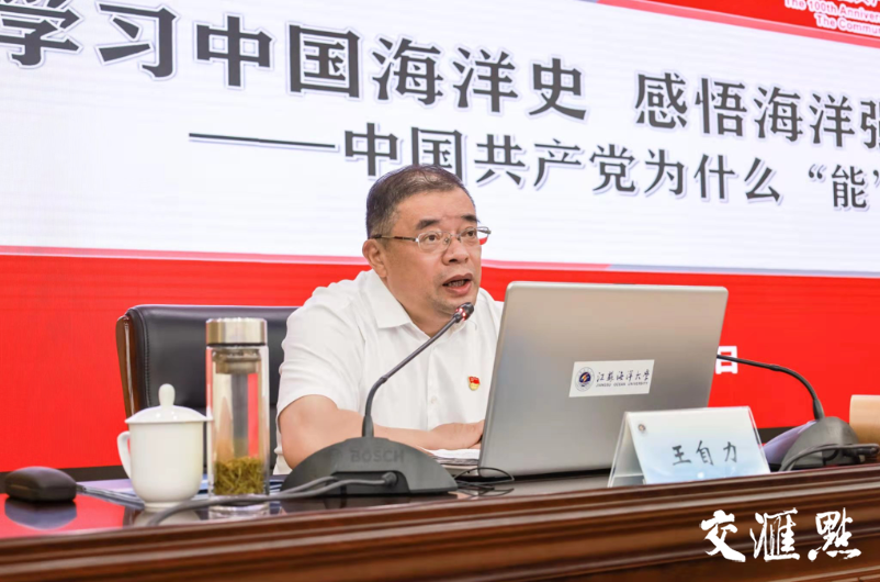 七一前夕,9999js金沙老品牌党委书记王自力以“学习中国海洋史 感悟海洋强国梦”为题,为全校师生讲授党史学习教育专题党课。