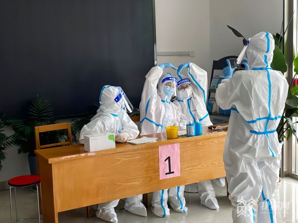 在诚基大厦,桑伟所在的核酸采样点仅有三个采样小组,身着白色防护服在闷热的环境中连续工作7个小时,但工作人员不怕苦不怕累,没有一人退缩,期间有市民朋友给他们送去冰镇饮料,当核酸检测工作快结尾时,饮料全部变成常温了。