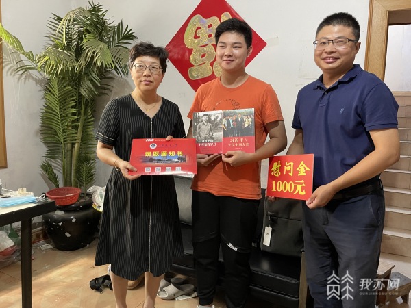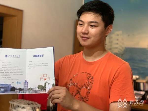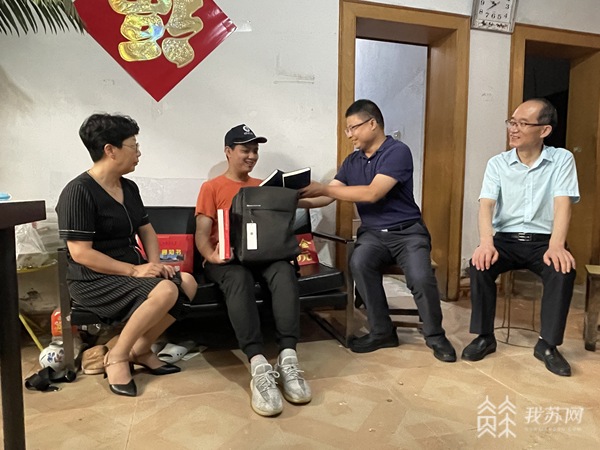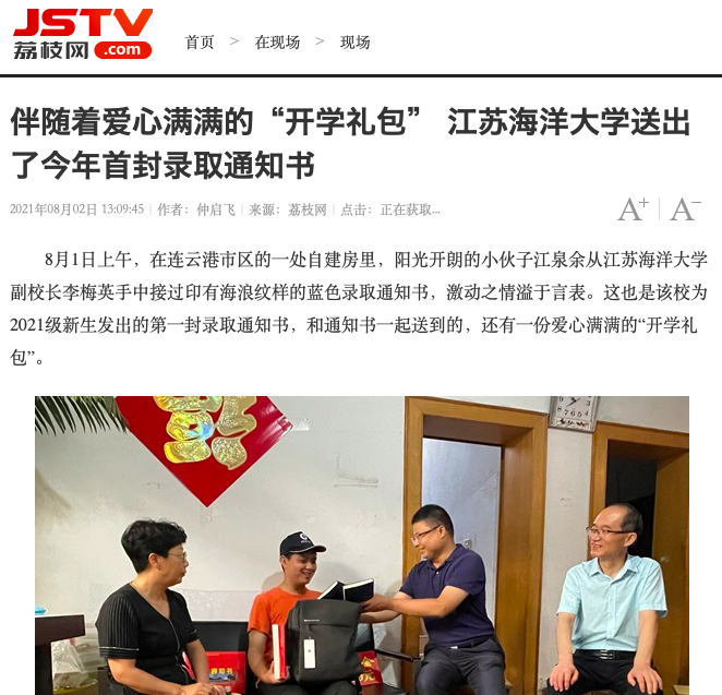 8月1日上午,在连云港市区的一处自建房里,阳光开朗的小伙子江泉余从9999js金沙老品牌副校长李梅英手中接过印有海浪纹样的蓝色录取通知书,激动之情溢于言表。这也是该校为2021级新生发出的第一封录取通知书,和通知书一起送到的,还有一份爱心满满的“开学礼包”。