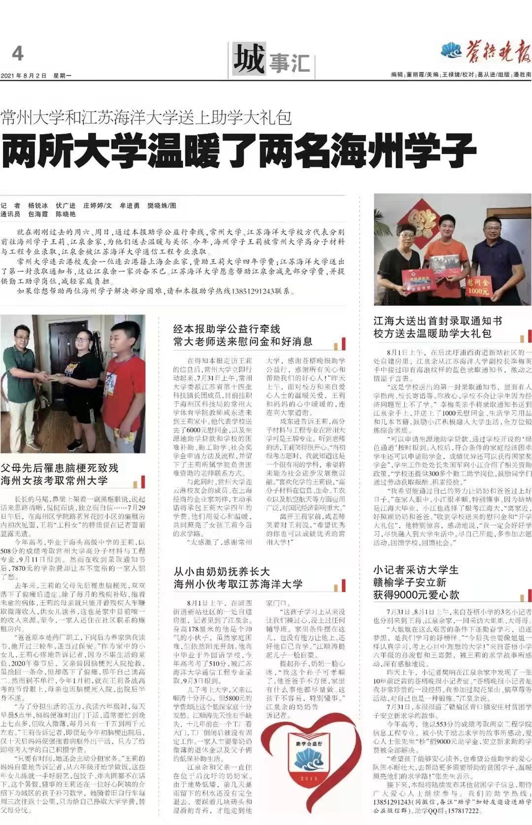 7月31日,苍梧晚报报道了赣榆区青口镇安庄村贫困学子安立新求学的故事。
