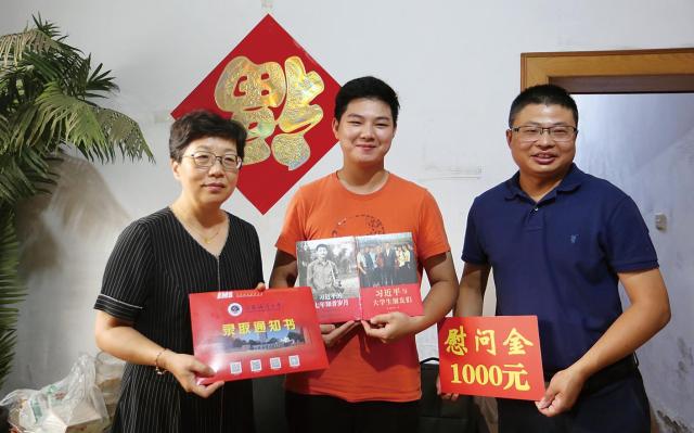 “这是学校送出的第一封录取通知书,里面有入学指南、校长寄语等。你放心,学校不会让学生因为经济问题而上不了学。”李梅英亲手将录取通知书送到江泉余手上,并送上了1000元慰问金、生活学习用品和几本书籍,鼓励小江积极融入大学生活,全方位锻炼综合素质。