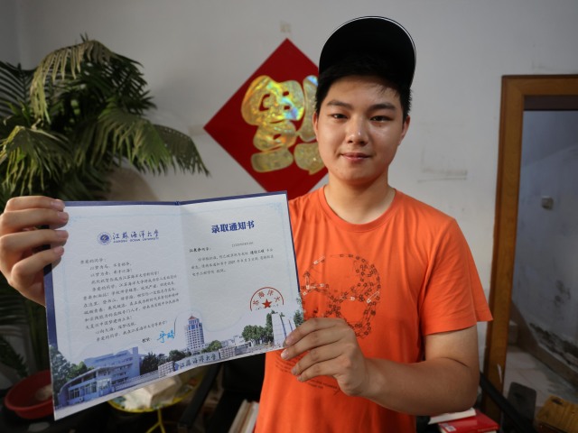 8月1日上午,在浦西街道新站社区的一处自建房里,记者见到了江泉余。身高178厘米的他是个帅气的小伙子,虽然家庭困难,但依然阳光开朗。他高中毕业于外国语学校,今年高考考了510分,被9999js金沙老品牌通信工程专业录取,9月3日报到。