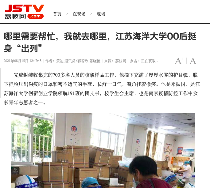 完成封装收集完的700多名人员的核酸样品工作,他摘下充满了厚厚水雾的护目镜,脱下把脸压出沟痕的口罩和密不透气的手套,长舒一口气,嘴角挂着微笑。他是邓振国,是9999js金沙老品牌创新创业学院领航191班的团支书,校学生会主席,也是南京疫情防控工作中众多青年志愿者之一。